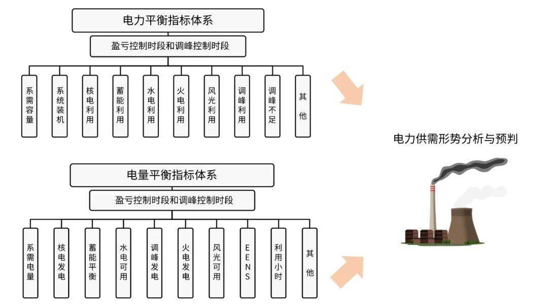 东北电力中短期供需预判的监管指标体系包括电力电量平衡指标体系和综合监管指标体系设计。基于精细化运行模拟的结果,通过构建电力电量平衡指标体系对电力供需形势进行分析预判(见图3)。