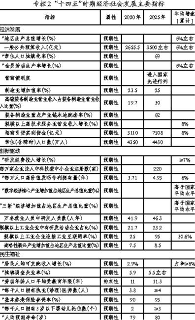 注:①地区生产总值、全员劳动生产率、居民收入的绝对数和增长速度,按可比价计算。 ②[]内为5年累计数。 ③指标名称前标注★的为参照国家规划《纲要》指标体系设置的指标。④一般公共预算收入含税收占比。 ⑤“三新”经济增加值占地区生产总值比重指标,待国家统计局公布相关统计标准和数据范围后再行测算。