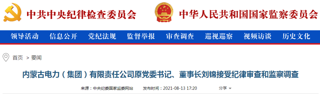 8月13日下午,中纪委网站发布消息,内蒙古电力(集团)有限责任公司原党委书记、董事长刘锦,和甘肃省电力投资集团有限责任公司原副总经理刘晓黎涉嫌严重违纪违法,目前正在接受纪律审查和监察调查。近期,甘肃已有多位领导涉嫌违纪违法被起诉并被逮捕。