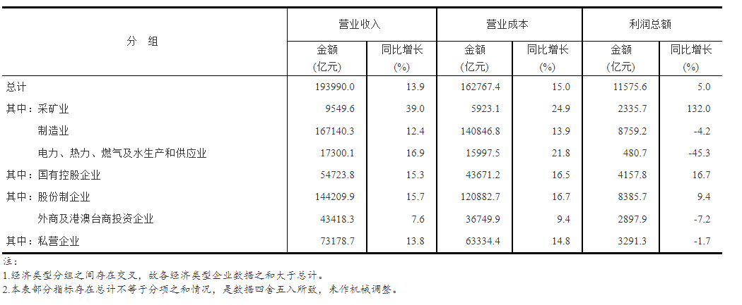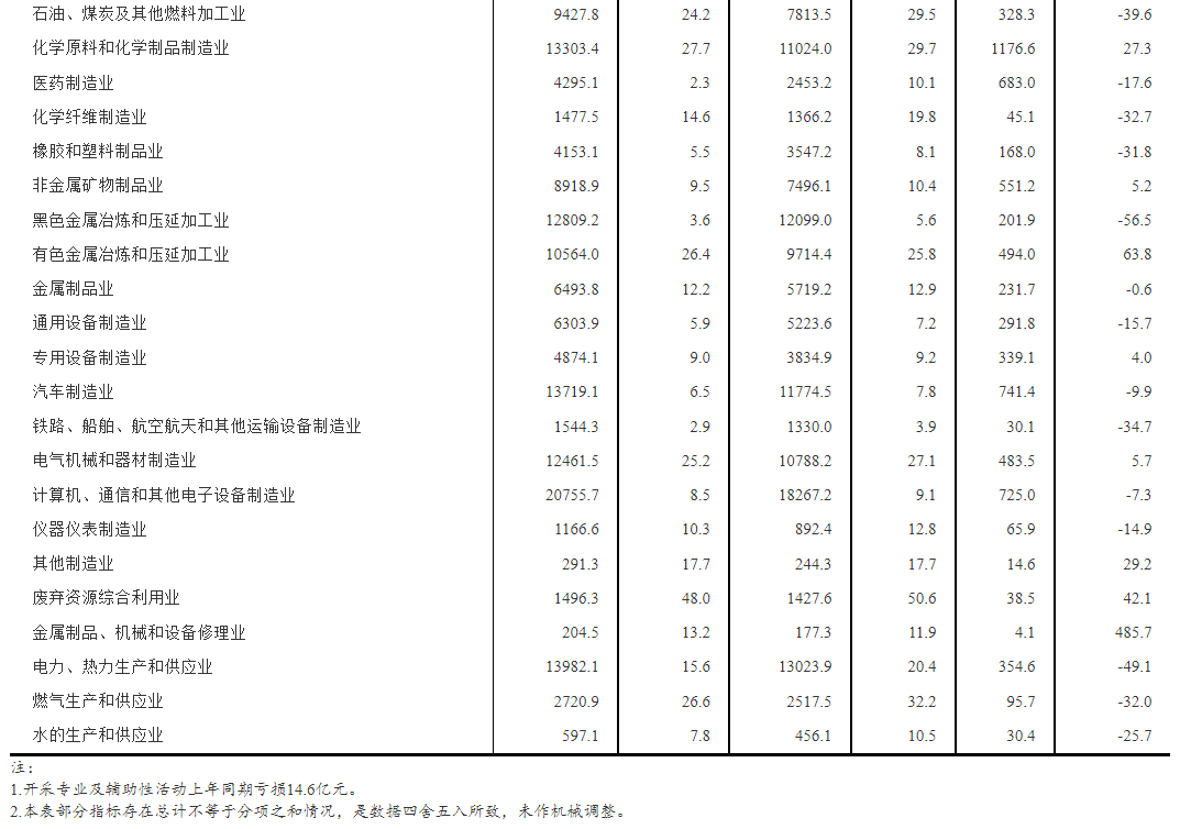 二、规模以上工业企业利润总额、营业收入等指标的增速均按可比口径计算。报告期数据与上年所公布的同指标数据之间有不可比因素,不能直接相比计算增速。其主要原因是:(一)根据统计制度,每年定期对规模以上工业企业调查范围进行调整。每年有部分企业达到规模标准纳入调查范围,也有部分企业因规模变小而退出调查范围,还有新建投产企业、破产、注(吊)销企业等变化。(二)加强统计执法,对统计执法检查中发现的不符合规模以上工业统计要求的企业进行了清理,对相关基数依规进行了修正。(三)加强数据质量管理,剔除跨地区、跨行业重复统计数据。