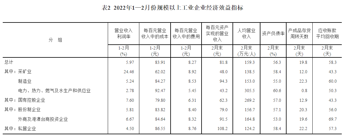 表1 2022年1—2月份规模以上工业企业主要财务指标