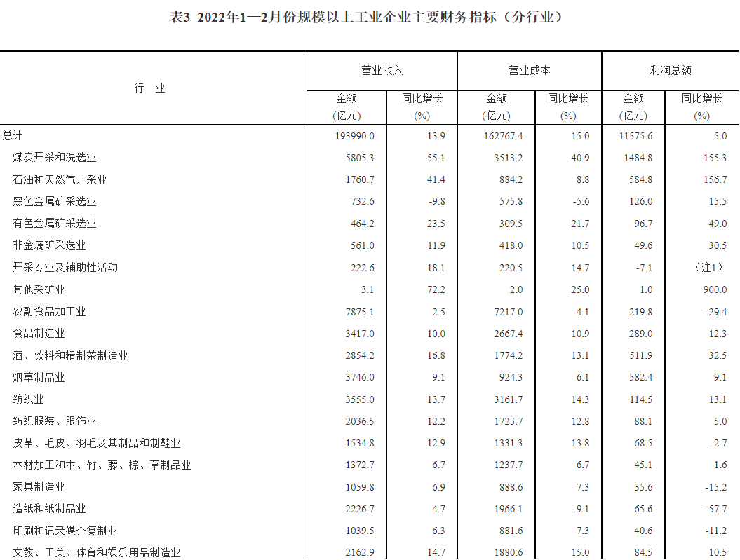 1—2月份,在41个工业大类行业中,21个行业利润总额同比增长,19个行业下降,1个行业减亏。主要行业利润情况如下:石油和天然气开采业利润总额同比增长1.57倍,煤炭开采和洗选业增长1.55倍,有色金属冶炼和压延加工业增长63.8%,化学原料和化学制品制造业增长27.3%,纺织业增长13.1%,电气机械和器材制造业增长5.7%,非金属矿物制品业增长5.2%,专用设备制造业增长4.0%,计算机、通信和其他电子设备制造业下降7.3%,汽车制造业下降9.9%,通用设备制造业下降15.7%,农副食品加工业下降29.4%,石油、煤炭及其他燃料加工业下降39.6%,电力、热力生产和供应业下降49.1%,黑色金属冶炼和压延加工业下降56.5%。
