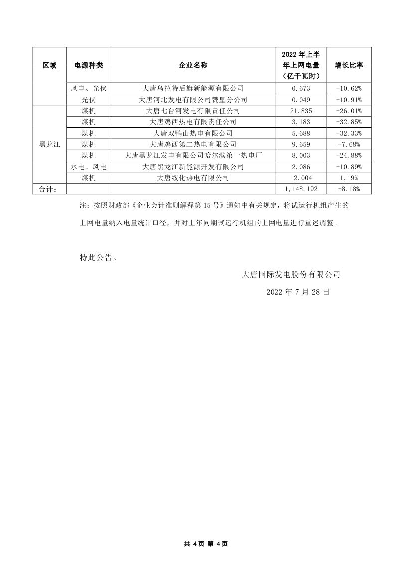 大唐发电上半年平均上网电价为人民币457.81元/兆瓦时