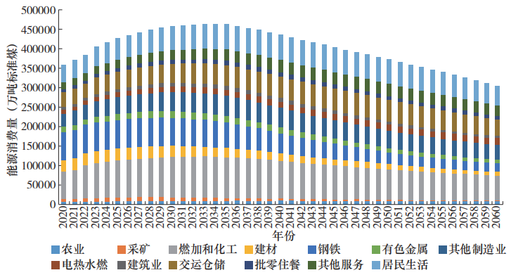在2035年基本实现社会主义现代化之后,随着产业结构优化调整的持续深入,单位GDP能耗更低的高新技术产业和服务业将在国民经济中占据更加突出的地位,我国经济增长将逐渐与能源消费增长脱钩,能源消费总量将从峰值平台逐步下降,预计到2050年、2060年分别降至约65.7亿吨、59.0亿吨标准煤,较峰值分别减少约6.1亿吨、12.8亿吨标准煤。