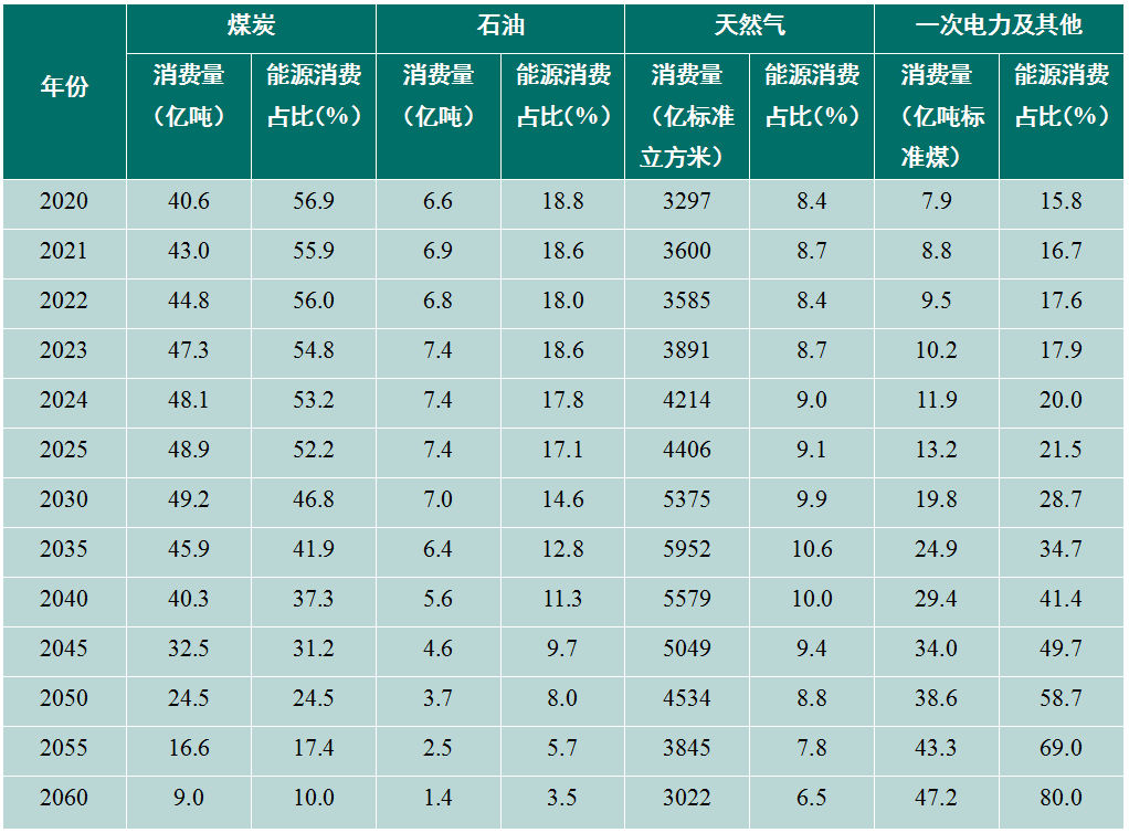 我国煤炭消费预计在“十五五”前中期进入49.5亿~51亿吨(国产原煤+进口商品煤)的峰值平台期,2030年略有回落至49亿吨左右,“十六五”时期下降显著,2035年降至46亿吨以内,但仍占据能源消费的主体地位(占比约42%)。2035年后,随着非化石能源规模化发展,火电用煤逐步下降,同时各行业终端用能电气化替代加速,煤炭消费量将加速下降,到2050年降至24.5亿吨左右,2060年进一步降至8亿~10亿吨,占一次能源消费的百分比较2024年下降43个百分点,保持在10%左右。