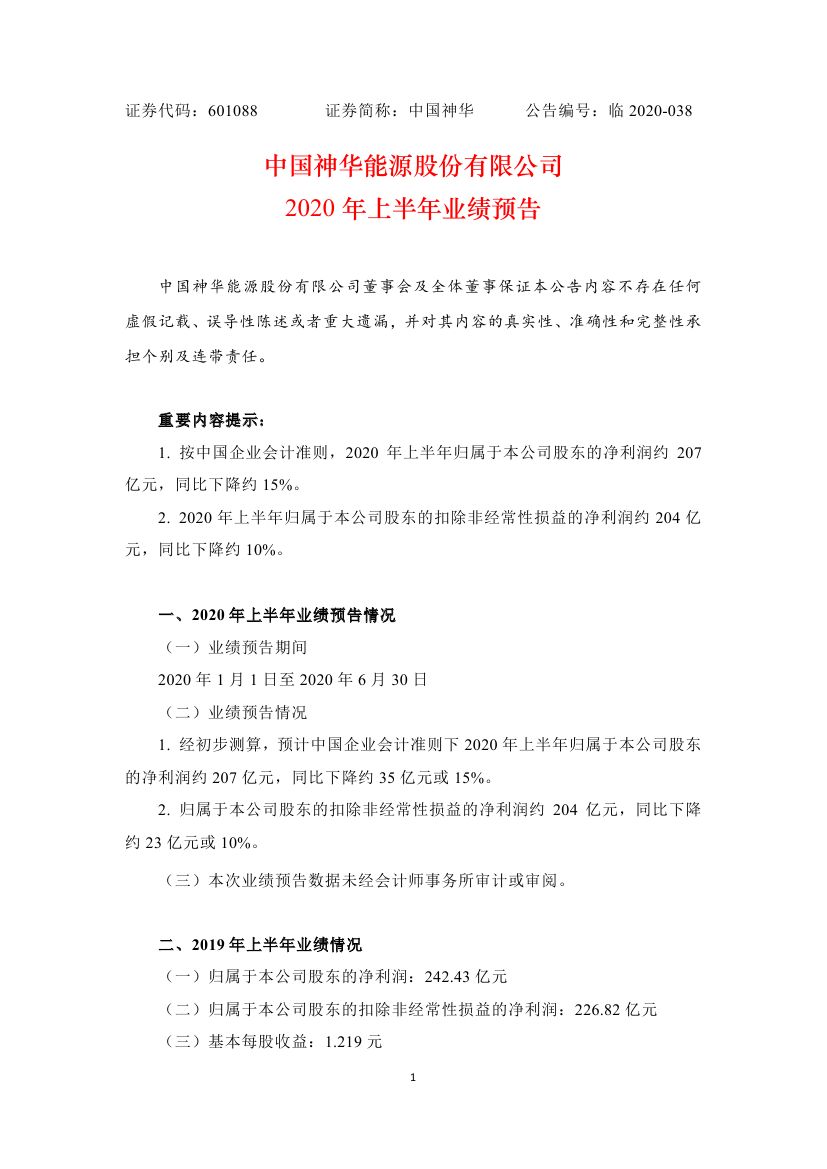 中国神华近日发布2020年上半年业绩预告,公告显示,2020年上半年归属于本公司股东的净利润约207亿元,同比下降约15%。 2020年上半年归属于本公司股东的扣除非经常性损益的净利润约204亿元,同比下降约10%。