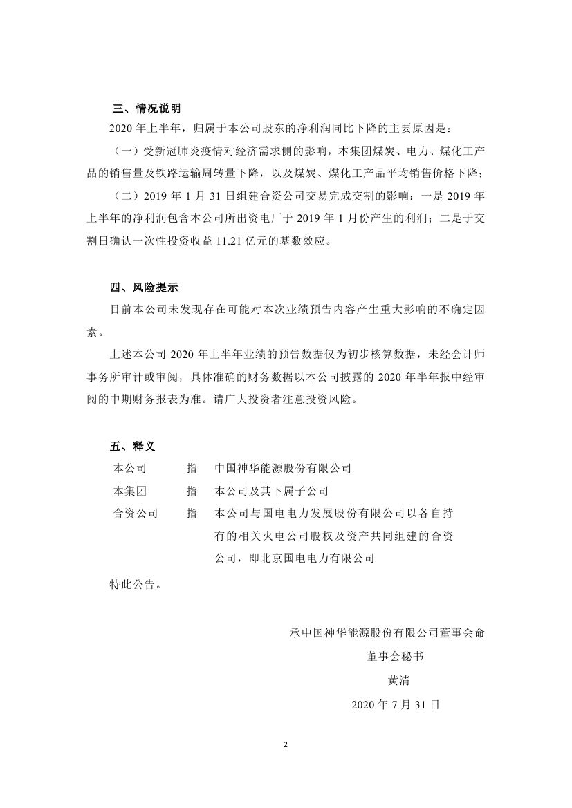 (一)受新冠肺炎疫情对经济需求侧的影响,本集团煤炭、电力、煤化工产品的销售量及铁路运输周转量下降,以及煤炭、煤化工产品平均销售价格下降;