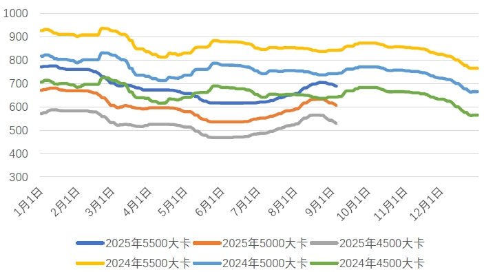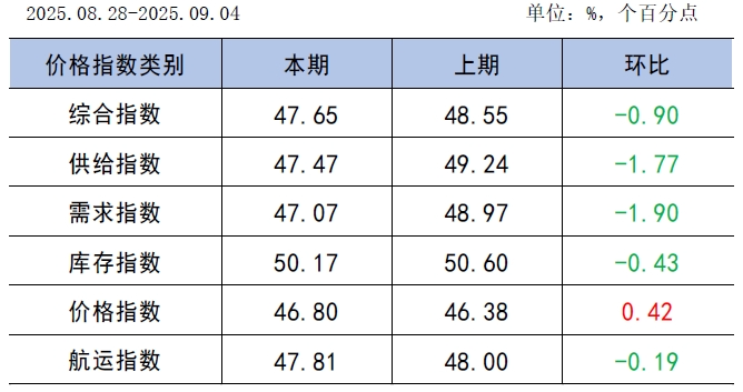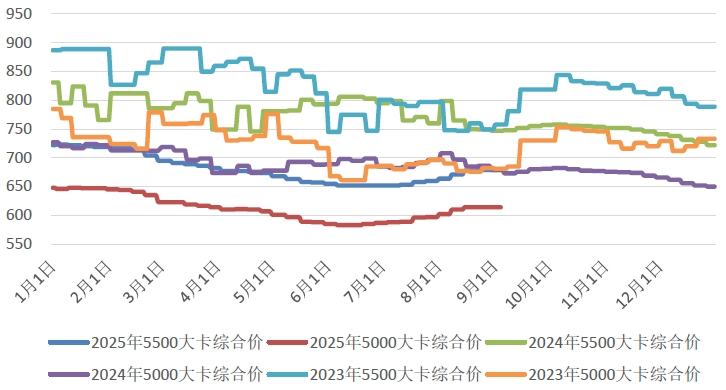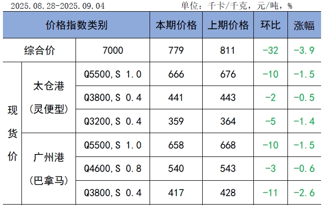 CECI进口指数到岸标煤单价779元/吨,较上期下降32元/吨,环比降幅3.9%。本期各煤种采购价格均有不同程度下降,其中太仓港(灵便型)5500千卡/千克价格环比下降10元/吨,广州港(巴拿马型)3800千卡/千克价格环比下降11元/吨。本周进口煤市场呈现“量价双降”的特征,国内外煤价保持下降趋势,印尼进入雨季,影响出货,价格下降幅度缓于内贸煤降幅,导致进口煤性价比进一步收窄。从本周实际成交情况来看,电厂依旧以采购性价比较高的印尼中低卡煤为主,高卡煤仍以零星刚需采购为主。现货市场流标现象加剧,贸易商为出货频繁压低投标价,但仍高于电厂预期价格,导致流标率上升。日前,电厂采购的货盘交货期集中于9月中下旬至10月中上旬,个别货盘至10月底。整体而言,市场预期偏弱,电厂观望情绪较浓,采购节奏随需求季节性转弱明显放缓。