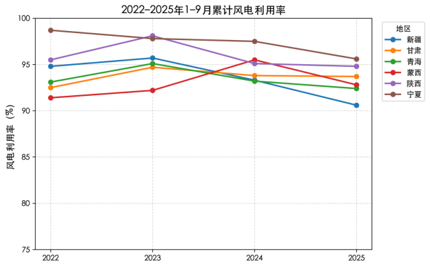 2023年,西北特高压通道平均利用率约为 55%,距离设计预期的 75% 尚有提升空间,在多个时段面临较高的弃风、弃光压力。自2024年起,西北多省区装机快速攀升,叠加受端负荷时段错配等因素的影响,其风光利用率出现下滑。2025年1–9月,西北风光富集区多地的光伏利用率降至 90% 以下,风电利用率保持在90%左右,相较2022–2023年的高点出现回落,反映出系统的调节和消纳能力需要进一步加强。
