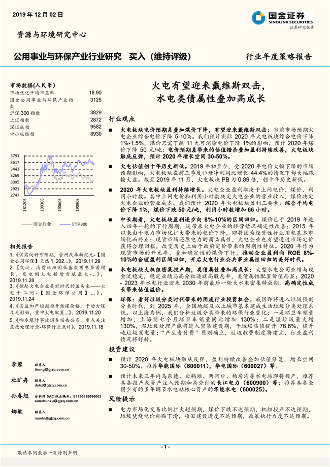 火电板块电价预期差叠加煤价下降,有望迎来戴维斯双击:当前市场预期火电企业综合电价下降5-10%。我们预计实际2020年火电板块综合电价下降1%-1.5%,煤价只需下跌11元可消除电价下降1%的影响,预计2020年煤价下降50元/吨;电价预期差带来的估值错杀叠加盈利持续改善,火电板块触底反弹,预计2020年增长空间30-50%。