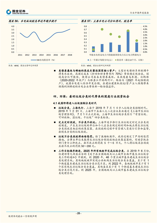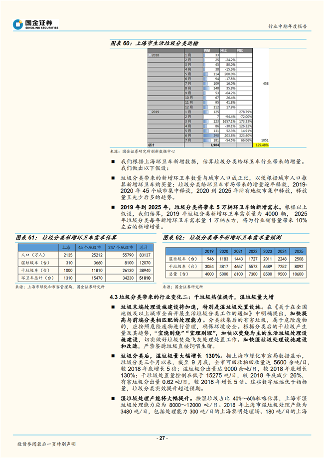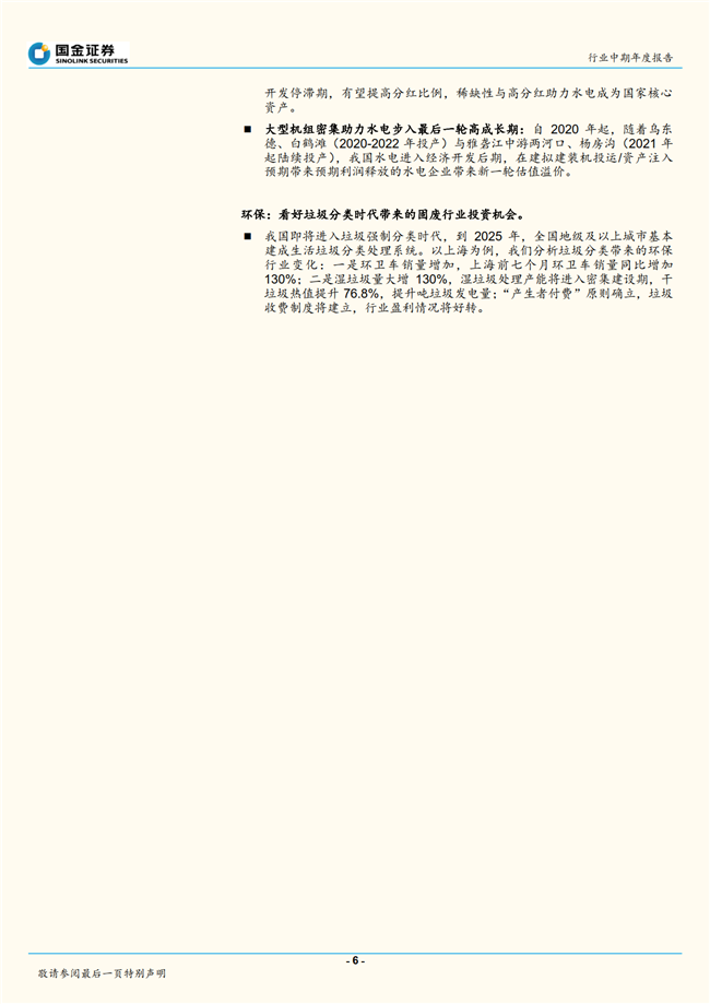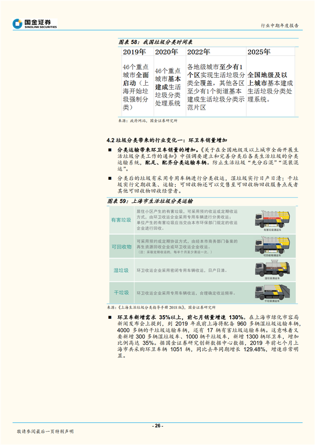 环保:看好垃圾分类时代带来的固废行业投资机会。我国即将进入垃圾强制分类时代,到2025年,全国地级及以上城市基本建成生活垃圾分类处理系统。以上海为例,我们分析垃圾分类带来的环保行业变化:一是环卫车销量增加,上海前七个月环卫车销量同比增加130%;二是湿垃圾量大增130%,湿垃圾处理产能将进入密集建设期,干垃圾热值提升76.8%,提升吨垃圾发电量;“产生者付费”原则确立,垃圾收费制度将建立,行业盈利情况将好转。