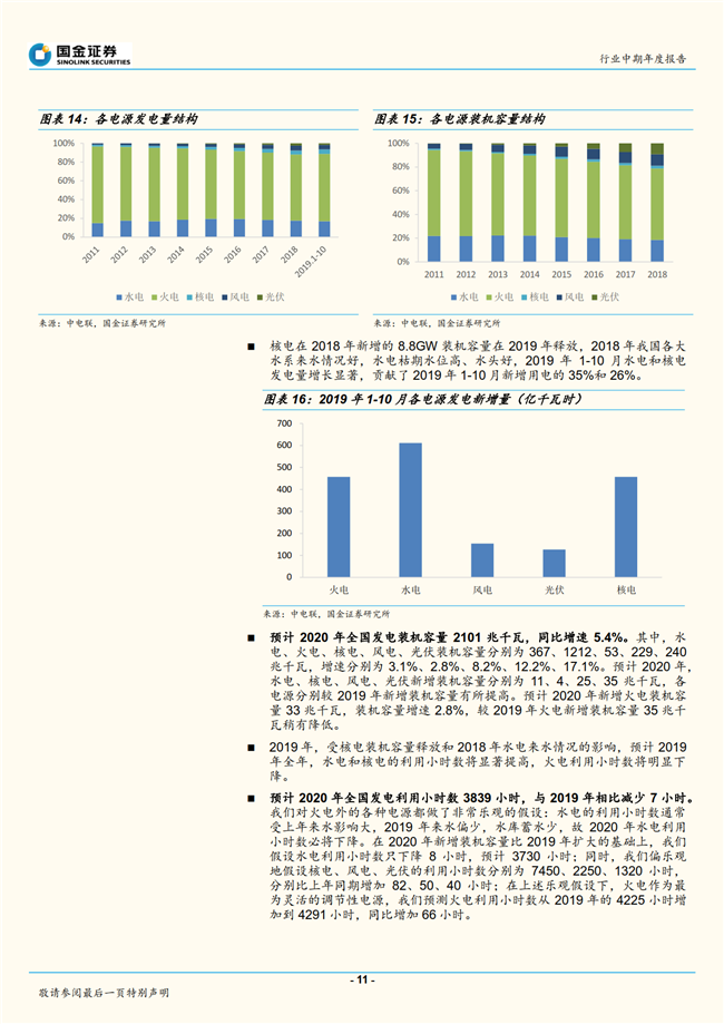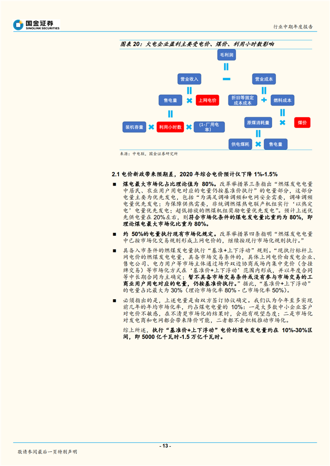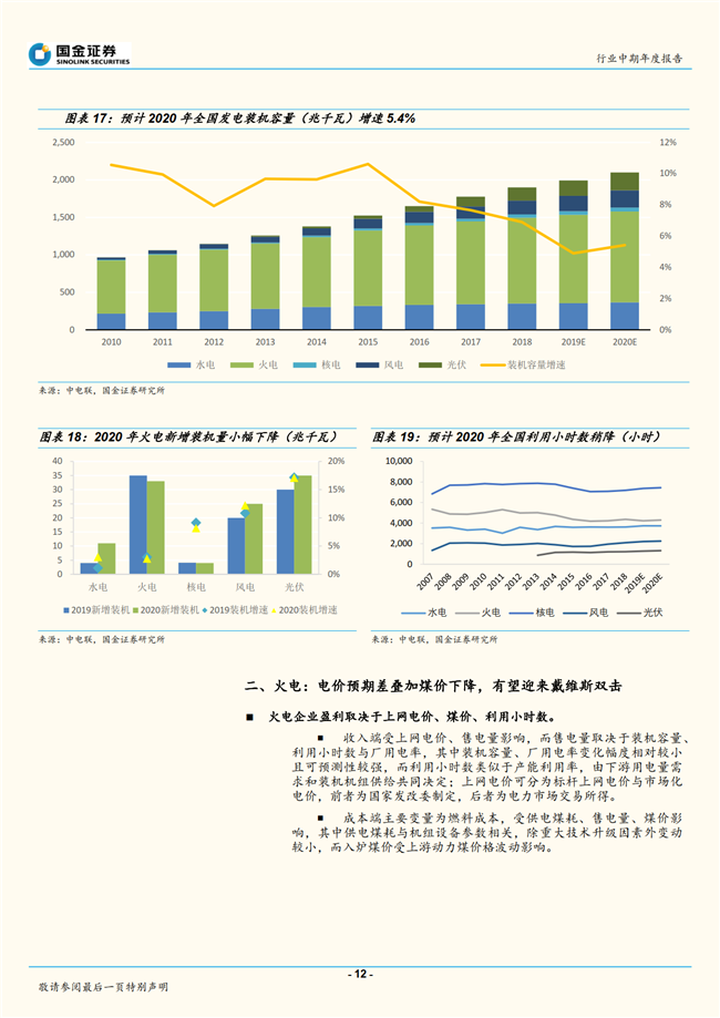 2020年火电板块盈利持续增长。火电企业盈利取决于上网电价、煤价、利用小时数。其中上网电价和利用小时数决定火电企业的营业收入,煤价决定火电企业的营业成本。我们预计2020年火电板块盈利三要素:综合平均电价下降1%,煤价下跌50元/吨,利用小时数增加66小时。