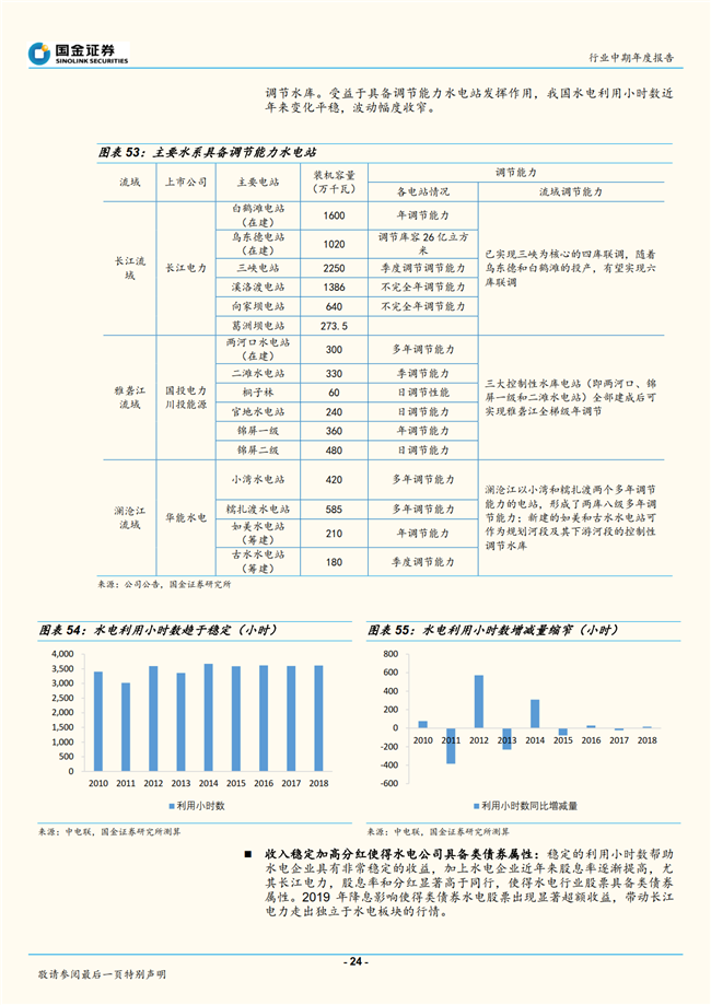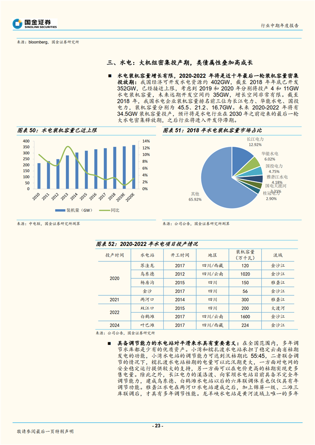 水电板块大机组密集投产期,类债属性叠加高成长:大型水电公司业绩与现金流稳定,稳定业绩与高分红造就高股息率,类债属性配置价值凸显;2020-2023年水电行业迎来2030年前最后一轮大水电密集释放期,高确定性成长带来估值溢价。