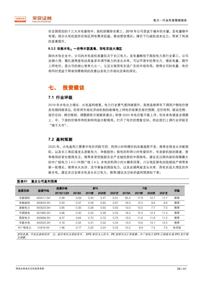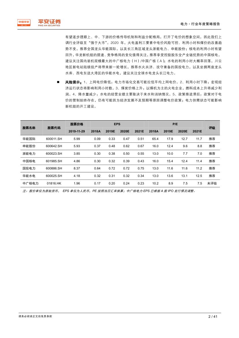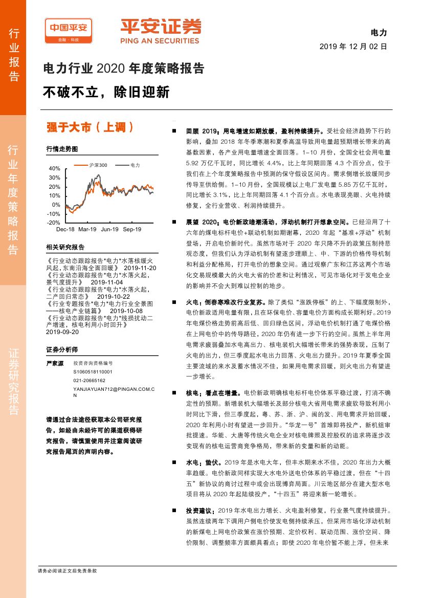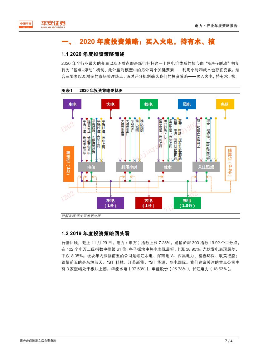 投资建议:2019年水电出力增长、火电盈利修复,行业景气度持续提升。虽然连续两年下调用户侧电价使发电侧持续承压,但采用市场化浮动机制的新煤电上网电价政策在涨价预期、定价权利、联动范围、涨价空间、降价限制、调整频率方面颇具看点;即使2020年电价暂不能上浮,但未来有望逐步理顺上、中、下游的价格传导机制和利益分配格局,打开了电价的想象空间,因此我们上调行业评级至“强于大市”。2020年,火电盈利三要素中电价风险可控、利用小时和煤价的改善趋势不变,推荐全国龙头华能国际,以及长三角区域龙头浙能电力、申能股份;核电的利用小时有望回升,华龙新机组的提速、竞争格局的变化值得关注,推荐享受控股股东全产业链优势的中国核电,建议关注国内装机规模最大的中广核电力(H)/中国广核(A);水电的利用小时大概率回落,川云地区新电站陆续投产将带来新一轮增长,推荐水火共济、攻守兼备的国投电力,以及坐拥两座龙头水库、西电东送大湾区的华能水电,建议关注全球水电龙头长江电力。