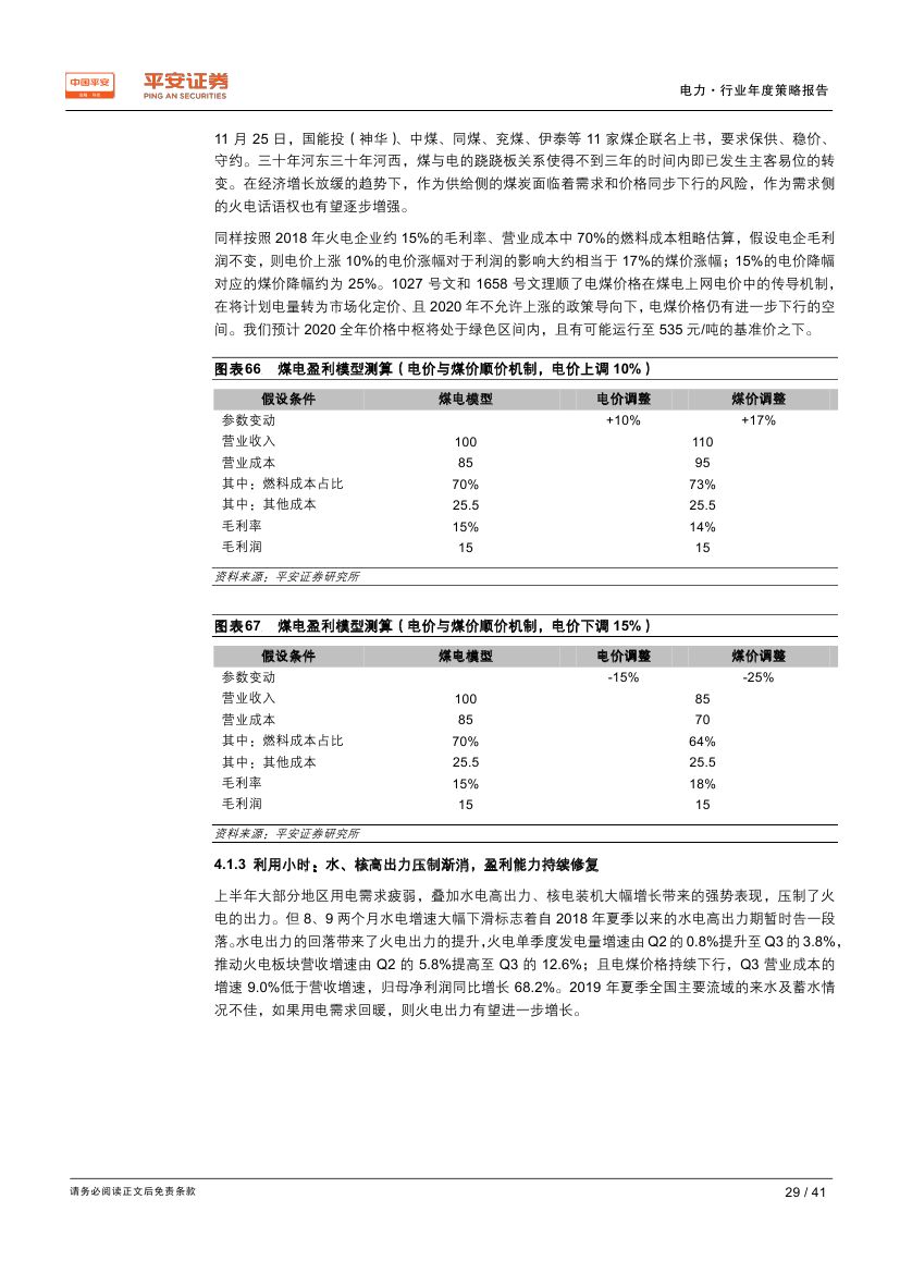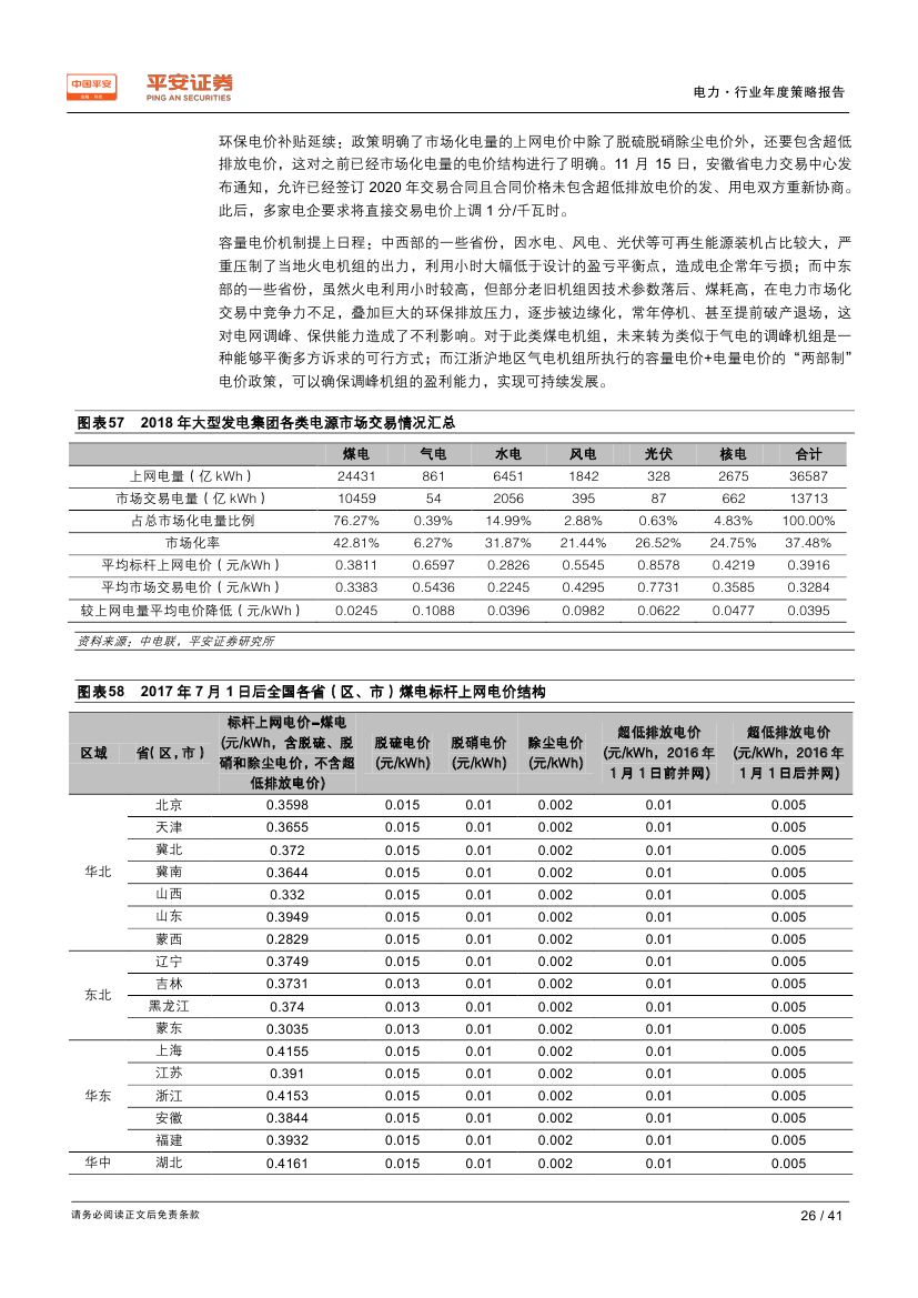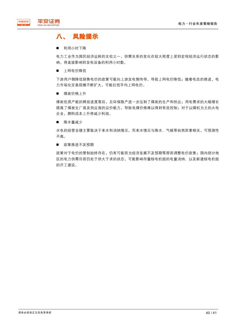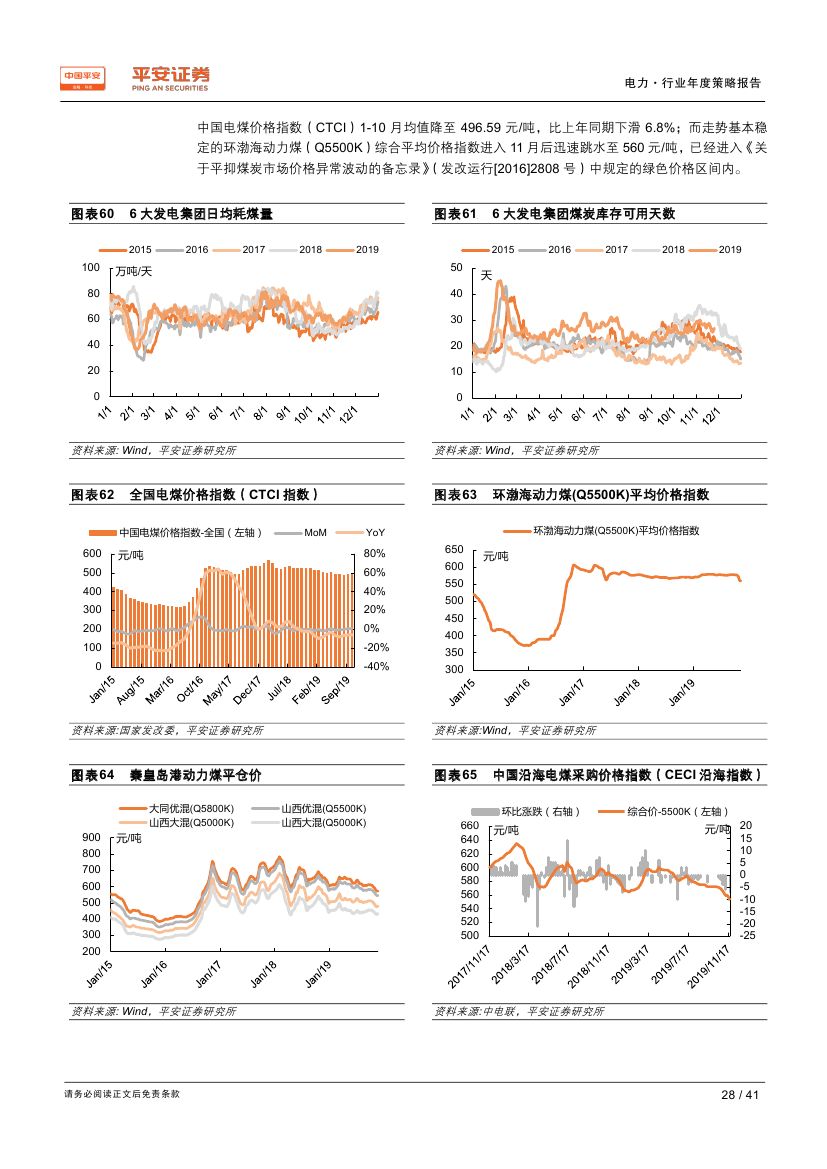 投资建议:2019年水电出力增长、火电盈利修复,行业景气度持续提升。虽然连续两年下调用户侧电价使发电侧持续承压,但采用市场化浮动机制的新煤电上网电价政策在涨价预期、定价权利、联动范围、涨价空间、降价限制、调整频率方面颇具看点;即使2020年电价暂不能上浮,但未来有望逐步理顺上、中、下游的价格传导机制和利益分配格局,打开了电价的想象空间,因此我们上调行业评级至“强于大市”。2020年,火电盈利三要素中电价风险可控、利用小时和煤价的改善趋势不变,推荐全国龙头华能国际,以及长三角区域龙头浙能电力、申能股份;核电的利用小时有望回升,华龙新机组的提速、竞争格局的变化值得关注,推荐享受控股股东全产业链优势的中国核电,建议关注国内装机规模最大的中广核电力(H)/中国广核(A);水电的利用小时大概率回落,川云地区新电站陆续投产将带来新一轮增长,推荐水火共济、攻守兼备的国投电力,以及坐拥两座龙头水库、西电东送大湾区的华能水电,建议关注全球水电龙头长江电力。