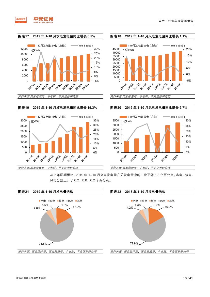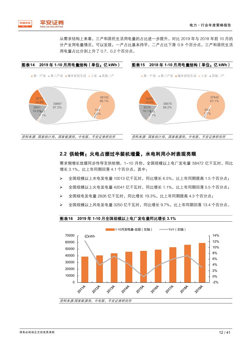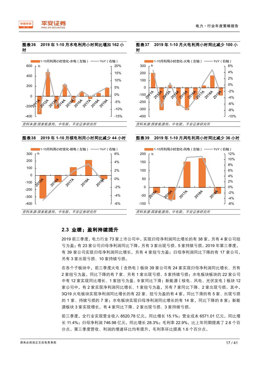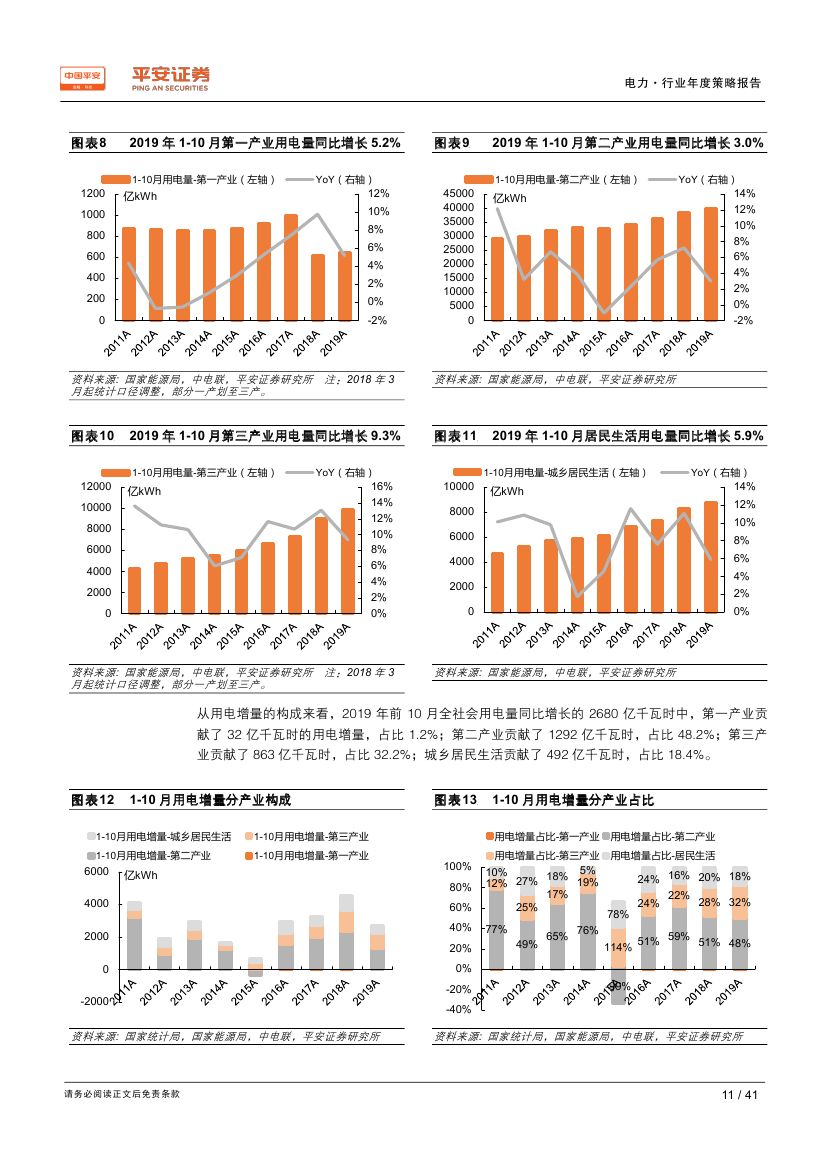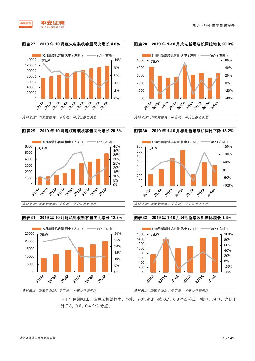 回顾2019:用电增速如期放缓,盈利持续提升。受社会经济趋势下行的影响,叠加2018年冬季寒潮和夏季高温导致用电量超预期增长带来的高基数因素,各产业用电量增速全面回落。1-10月份,全国全社会用电量5.92万亿千瓦时,同比增长4.4%,比上年同期回落4.3个百分点,位于我们在上个年度策略报告中预测的保守假设区间内。需求侧增长放缓同步传导至供给侧。1-10月份,全国规模以上电厂发电量5.85万亿千瓦时,同比增长3.1%,比上年同期回落4.1个百分点。水电表现亮眼、火电持续修复,全行业营收、利润持续提升。