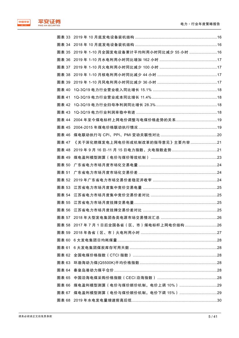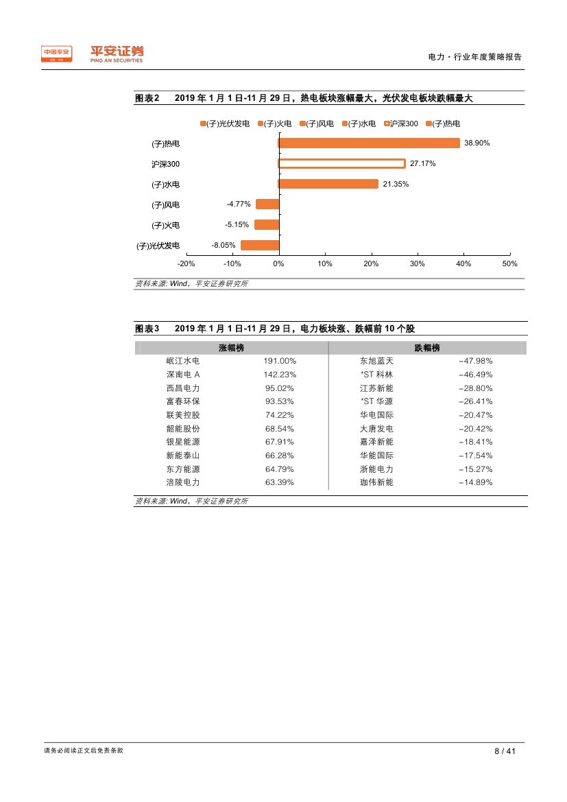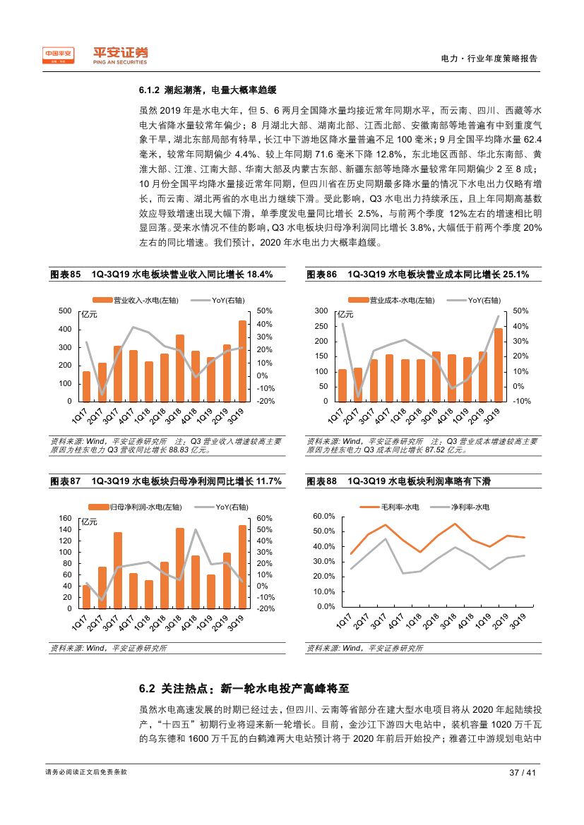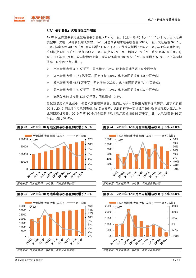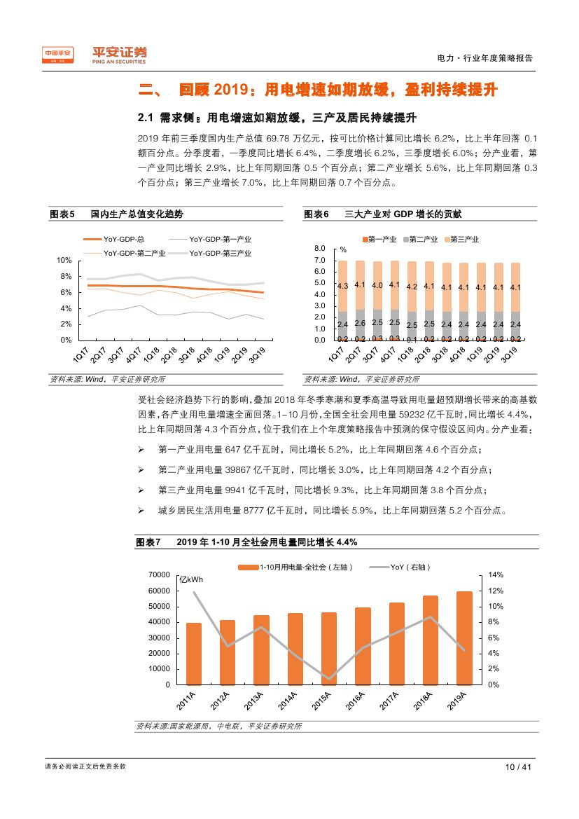 回顾2019:用电增速如期放缓,盈利持续提升。受社会经济趋势下行的影响,叠加2018年冬季寒潮和夏季高温导致用电量超预期增长带来的高基数因素,各产业用电量增速全面回落。1-10月份,全国全社会用电量5.92万亿千瓦时,同比增长4.4%,比上年同期回落4.3个百分点,位于我们在上个年度策略报告中预测的保守假设区间内。需求侧增长放缓同步传导至供给侧。1-10月份,全国规模以上电厂发电量5.85万亿千瓦时,同比增长3.1%,比上年同期回落4.1个百分点。水电表现亮眼、火电持续修复,全行业营收、利润持续提升。