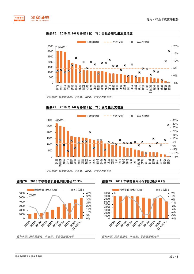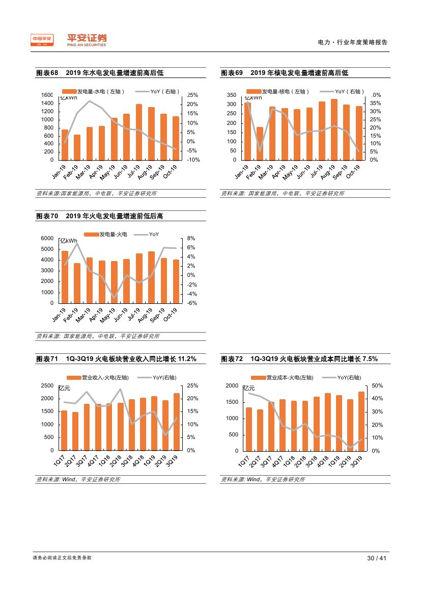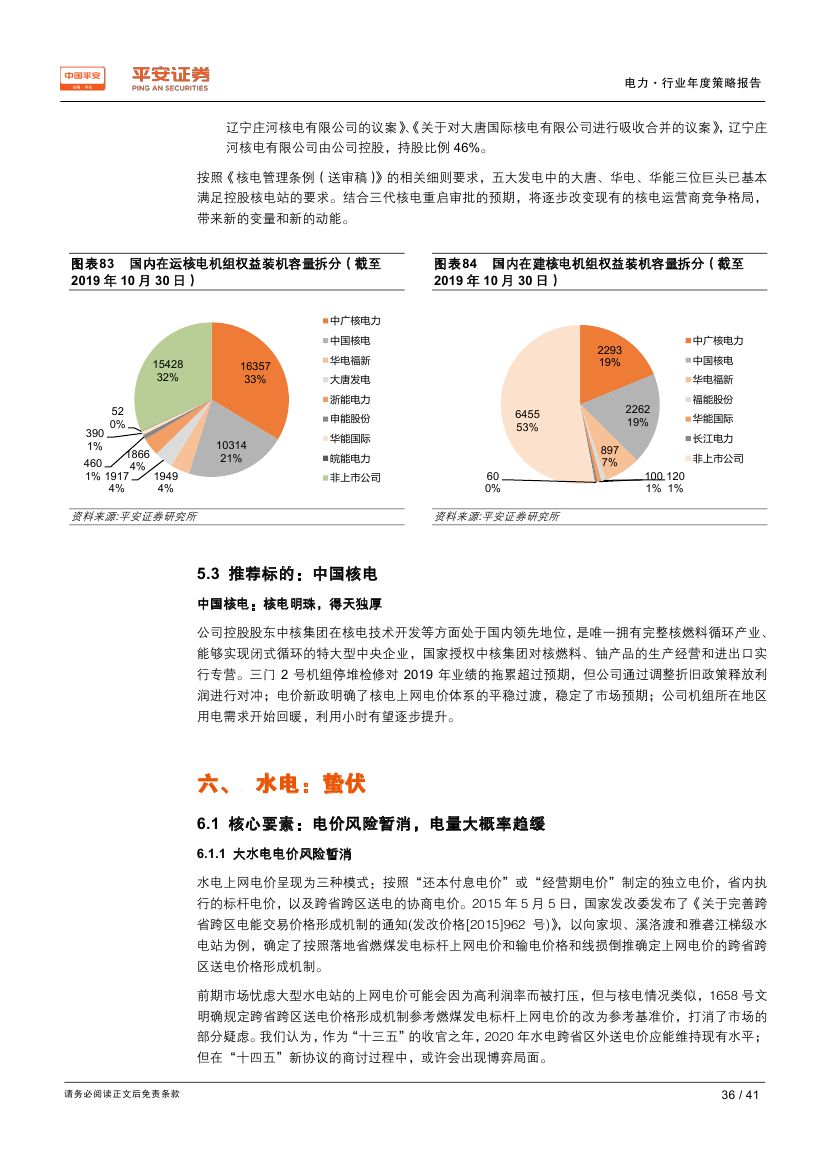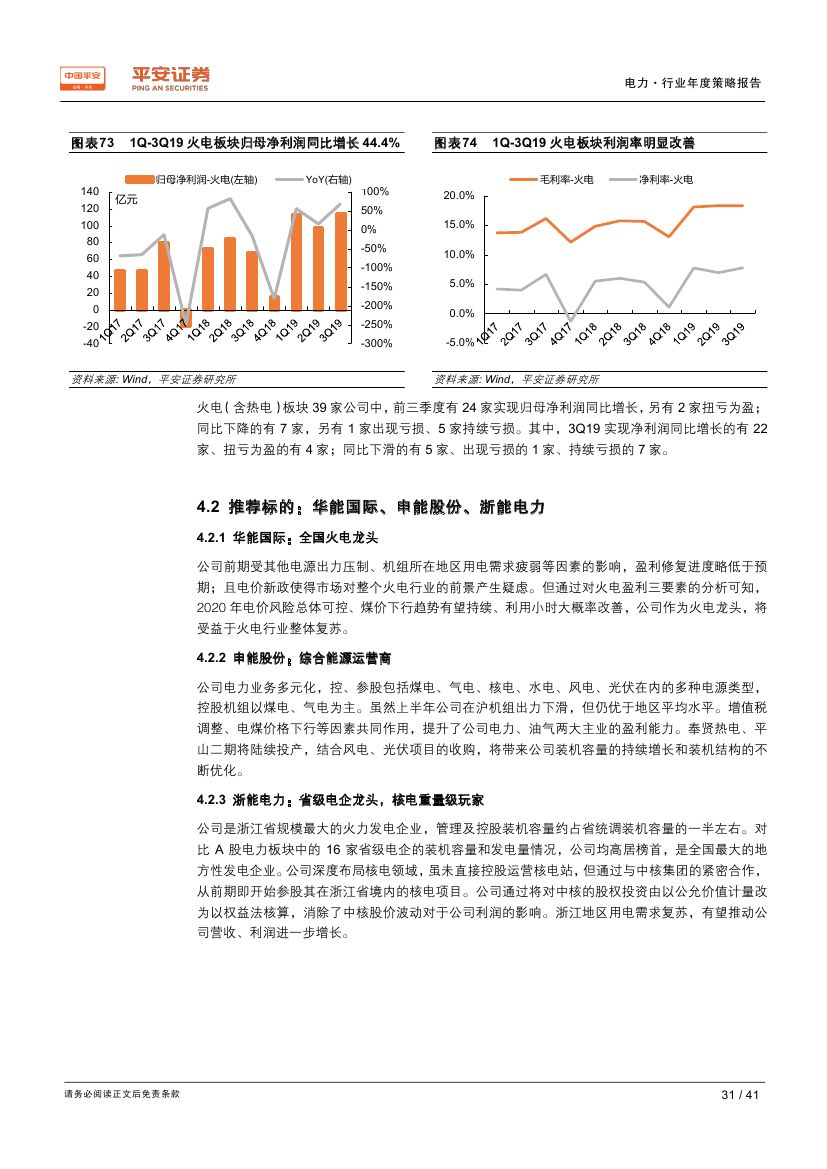 核电:看点在增量。电价新政明确核电标杆电价体系平稳过渡,打消不确定性的预期。新增装机大幅增长及部分核电大省用电需求疲软导致利用小时同比下滑,但三季度起,粤、苏、浙、沪、闽的发、用电需求开始回暖,2020年利用小时有望进一步回升。“华龙一号”首堆即将投产,新机组审批提速。华能、大唐等传统火电企业对核电牌照及控股权的追求将逐步改变现有的核电运营商竞争格局,带来新的变量和新的动能。