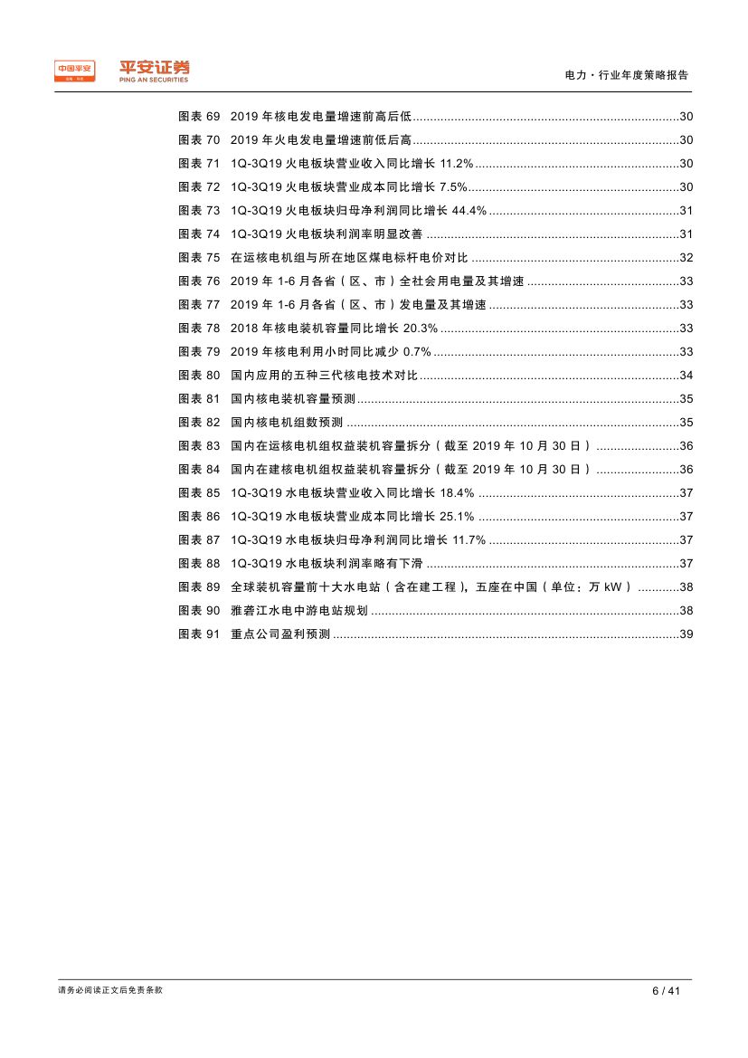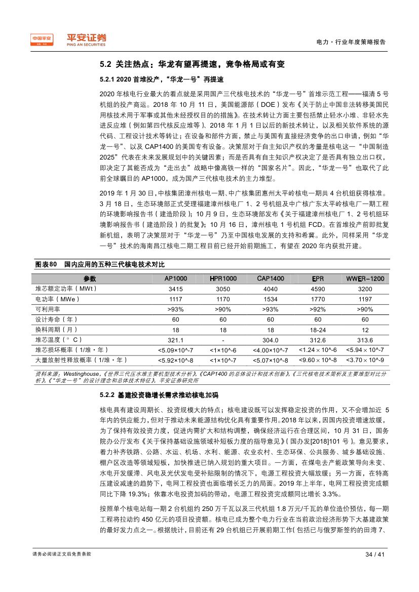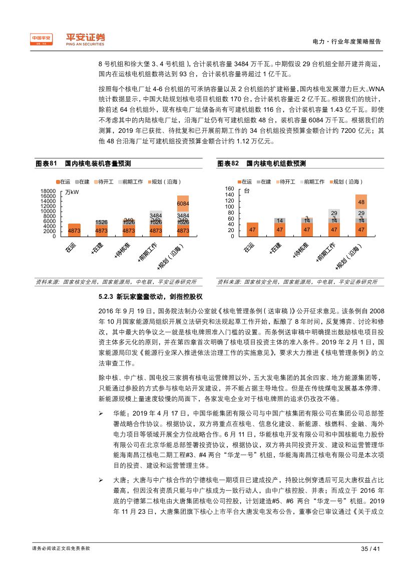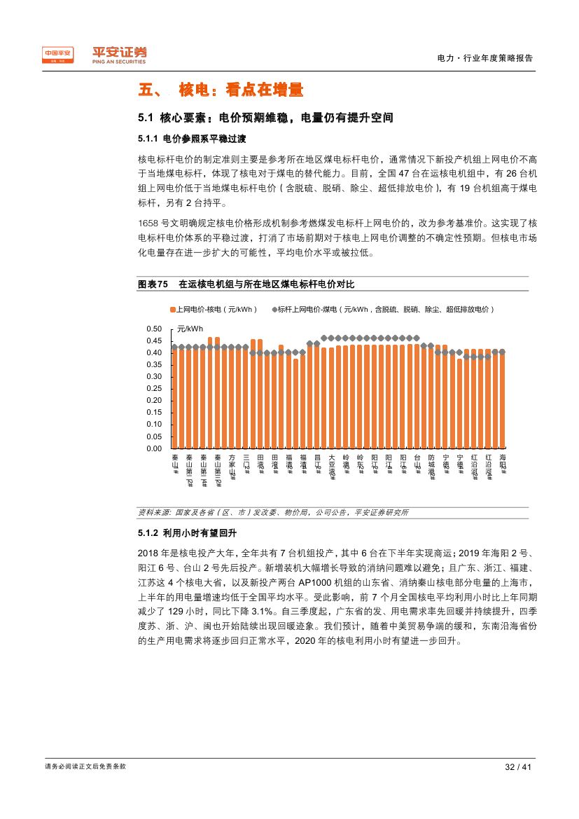 核电:看点在增量。电价新政明确核电标杆电价体系平稳过渡,打消不确定性的预期。新增装机大幅增长及部分核电大省用电需求疲软导致利用小时同比下滑,但三季度起,粤、苏、浙、沪、闽的发、用电需求开始回暖,2020年利用小时有望进一步回升。“华龙一号”首堆即将投产,新机组审批提速。华能、大唐等传统火电企业对核电牌照及控股权的追求将逐步改变现有的核电运营商竞争格局,带来新的变量和新的动能。