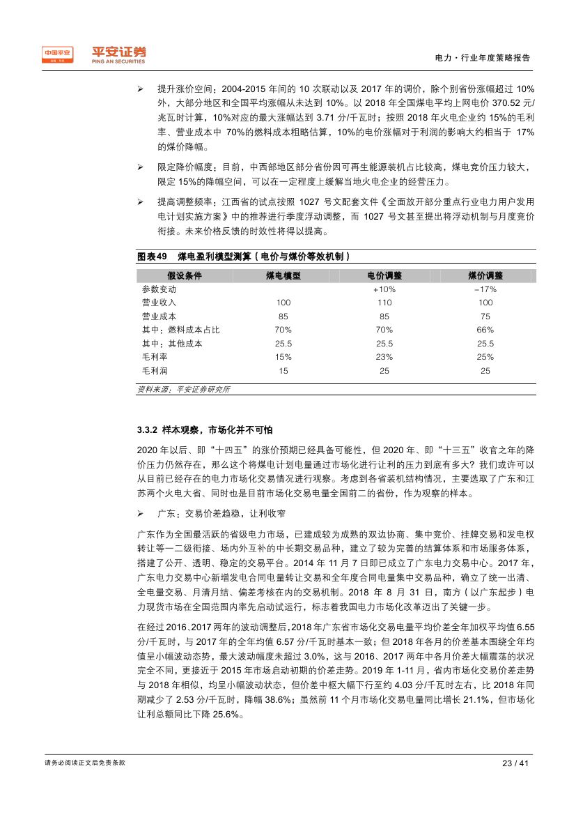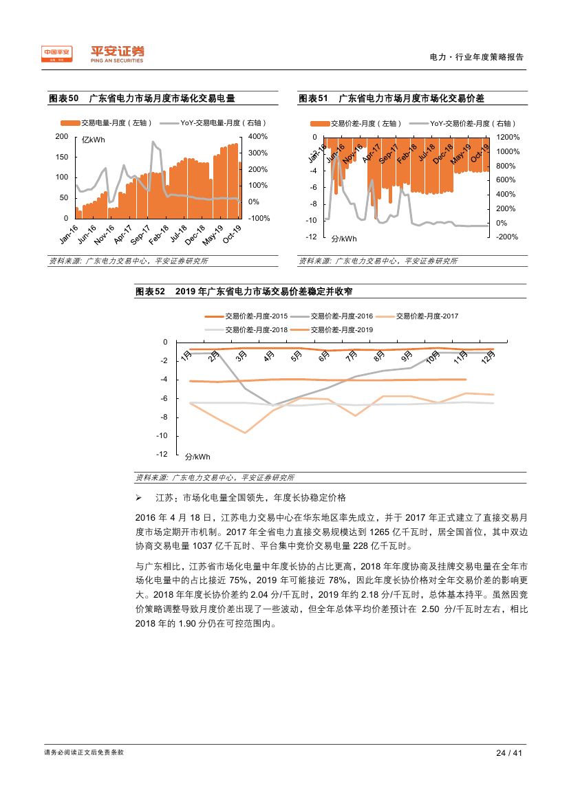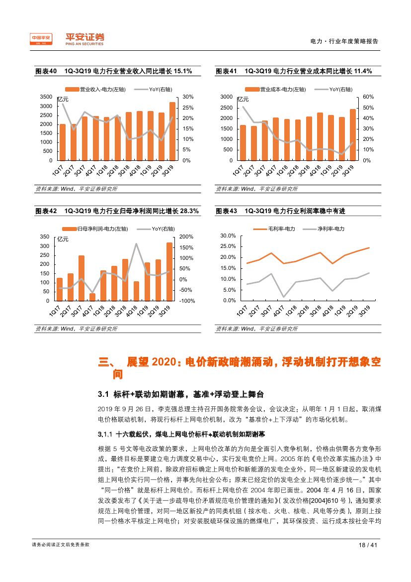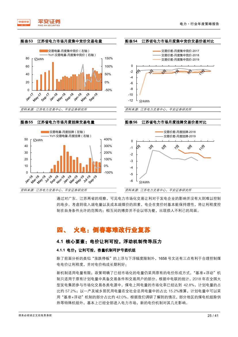 展望2020:电价新政暗潮涌动,浮动机制打开想象空间。已经沿用了十六年的煤电标杆电价+联动机制如期谢幕,2020年起“基准+浮动”机制登场,开启电价新时代。虽然市场对于2020年只降不升的政策压制持悲观态度,但我们认为浮动机制有望逐步理顺上、中、下游的价格传导机制和利益分配格局,打开电价的想象空间。通过观察广东和江苏这两个市场化交易规模最大的火电大省的价差和让利情况,可见市场化对于发电企业的影响并不会大到难以控制的地步。