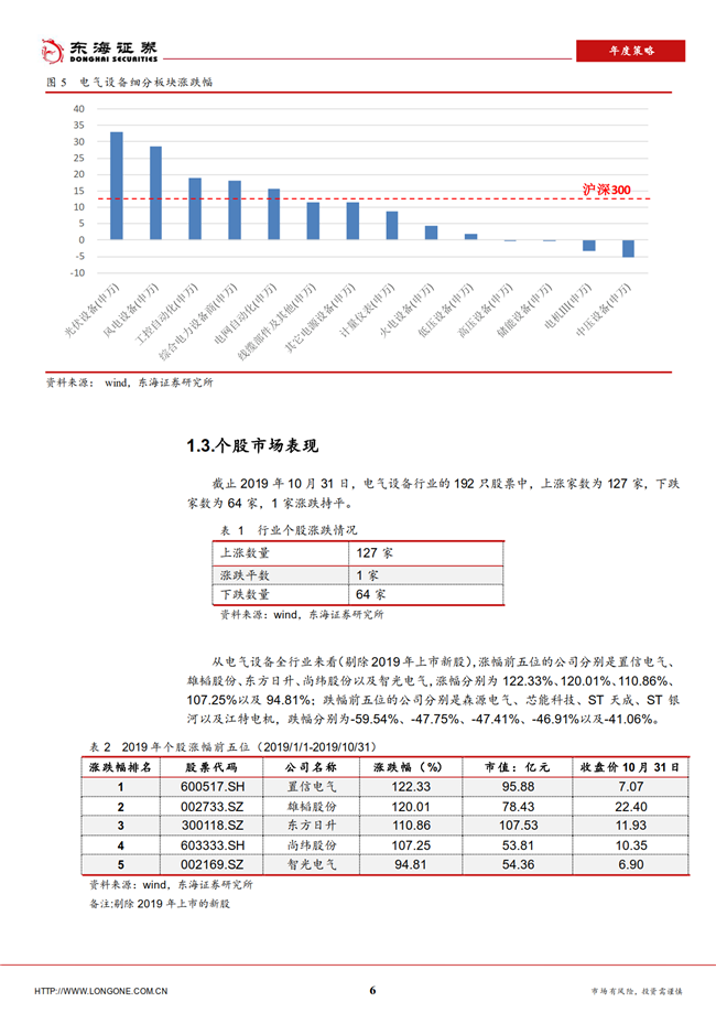 今年1-10月,电气设备(申万)涨幅13.33%,处于市场中游。2019年大盘指数表现较好,上证指数由1月份的最低点2440.91点一路上攻至3288.45点后回落,而后5月份至今,指数在2750点至3050点区间内进行上下震荡,目前量能有所萎缩。截止10月31日,沪深300指数较年初上涨了29.1%,电气设备(申万)上涨13.33%,相较沪深300指数跑输指数15.77百分点,在28个行业中排名第16位,处于中游。从总体走势来看,电气设备行业今年指数的上涨行情中表现得较为弱势,我们认为主要是受到我国经济发展下行压力和我国电力工程投资下降等因素的影响,未来电气设备行业的竞争压力将继续加剧,行业整体的下行压力较大。