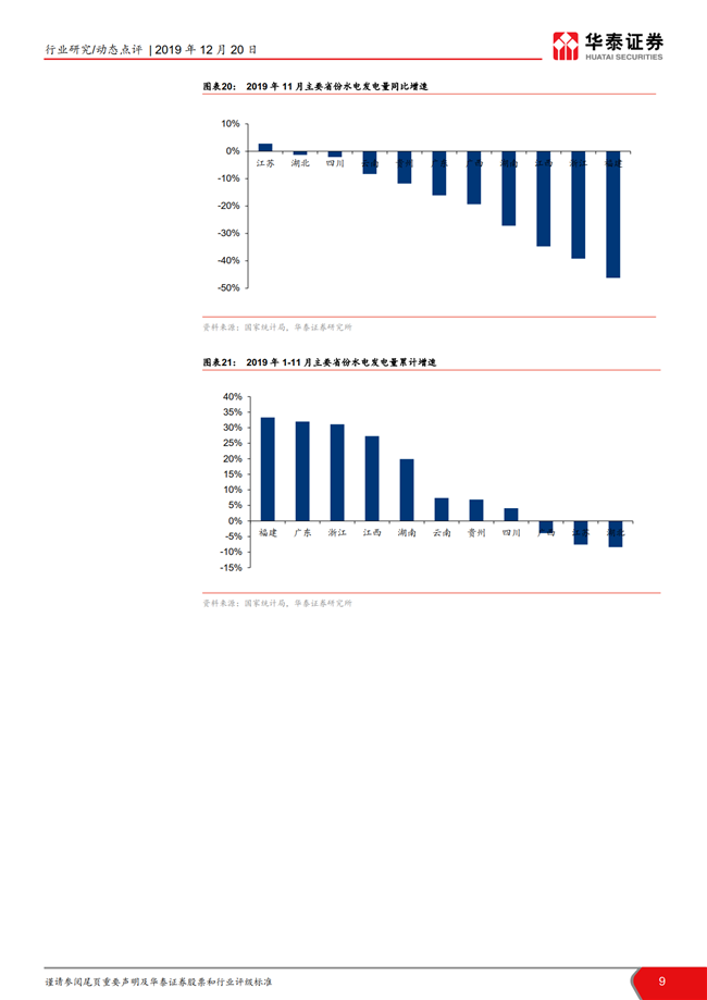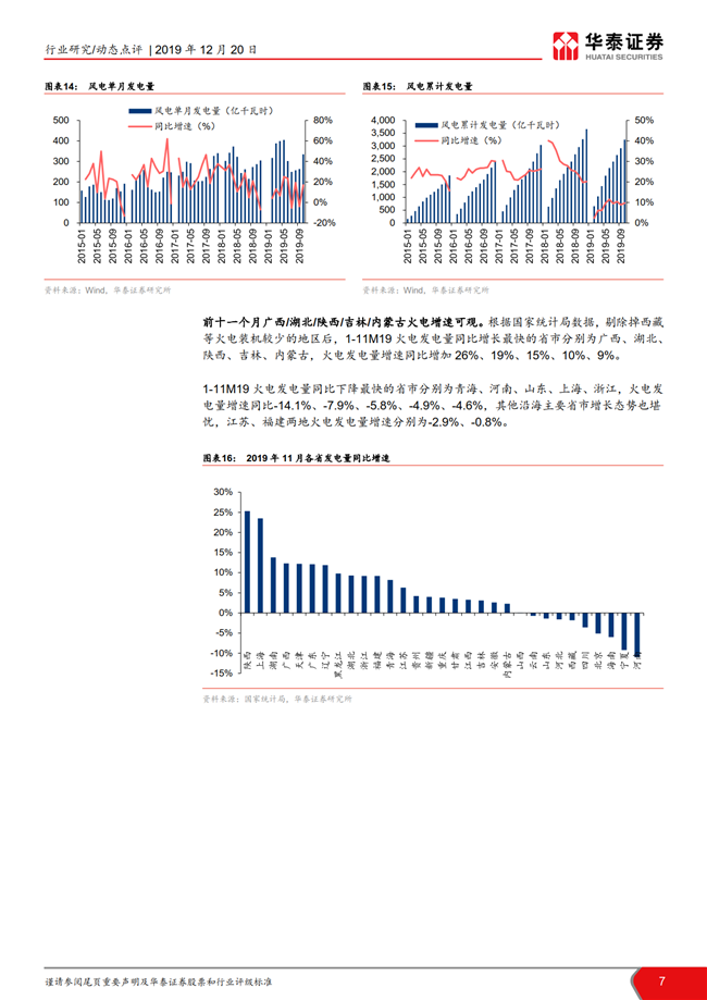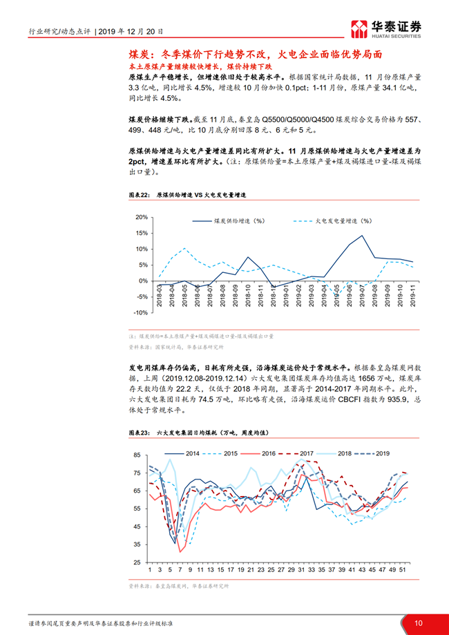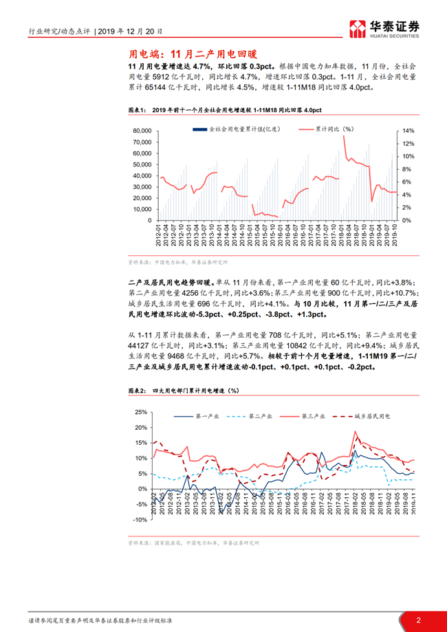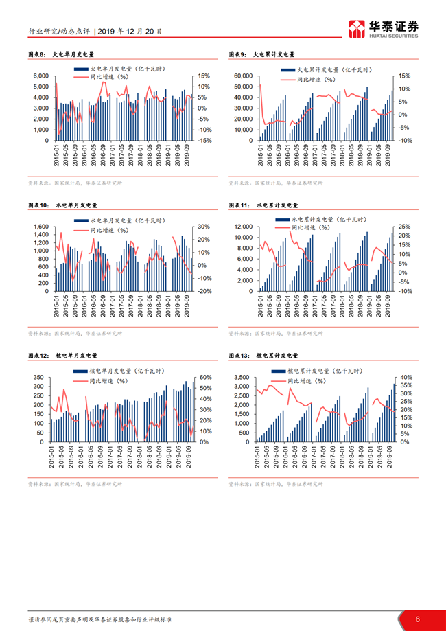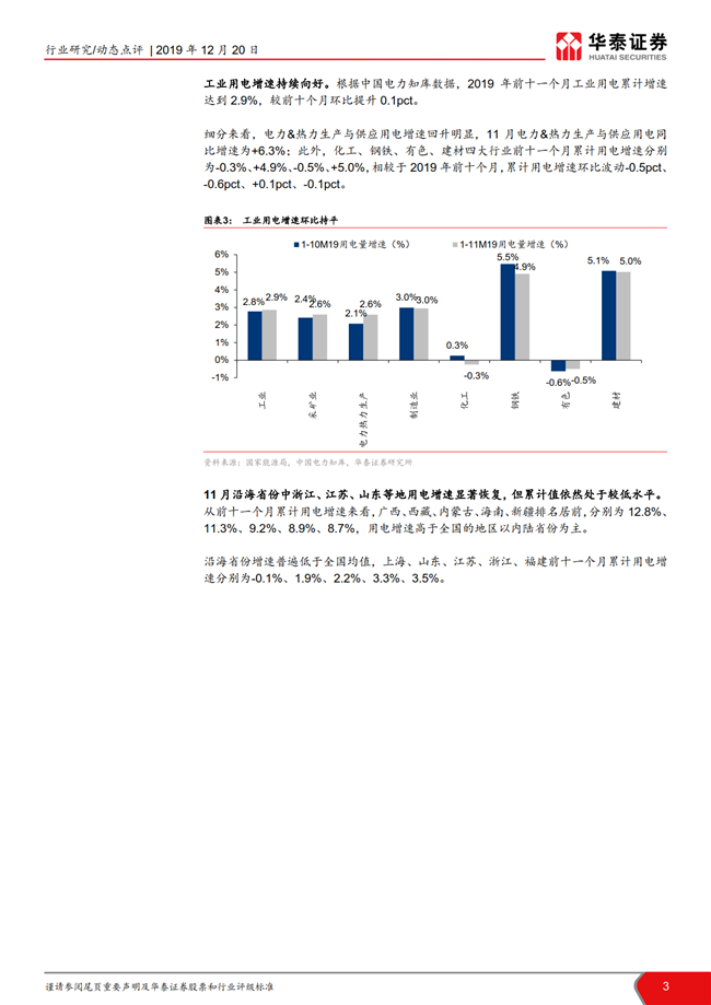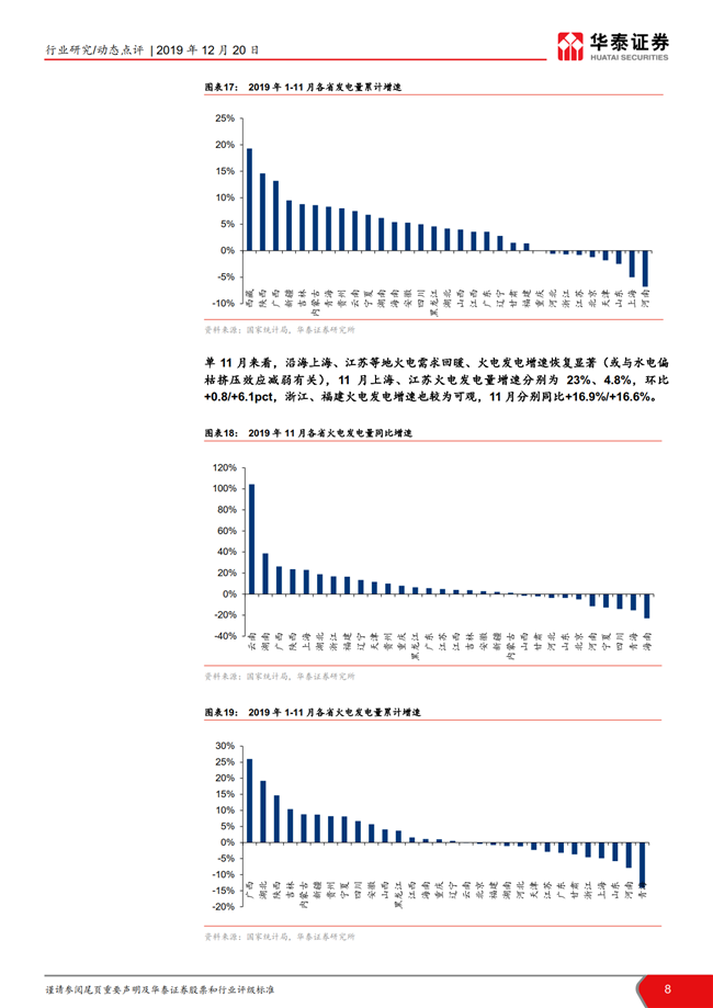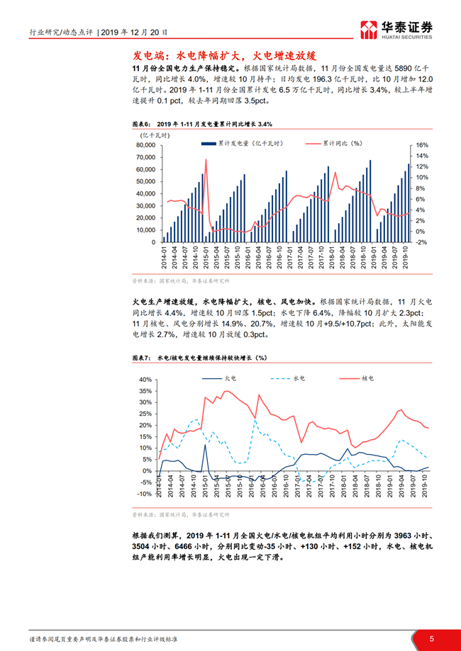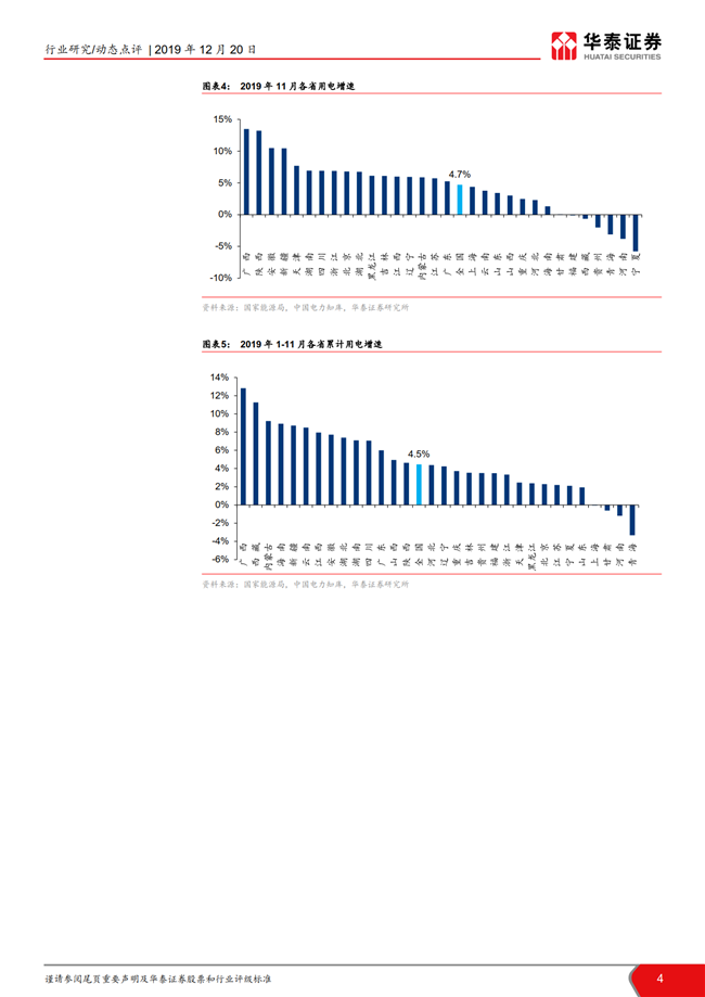 根据国家统计局数据,11月全国发电量同比增长4.0%,增速环比持平;火电发电量同比增长4.4%,增速环比放缓1.5pct。11月全社会用电量同比增长 4.7%,增速环比回落0.3pct,二产及居民用电趋势回暖。目前火电板块的市净率处于历史低位,建议左侧布局火电龙头华能国际,二线火电推荐内蒙华电/长源电力和低估值的皖能电力/京能电力/福能股份。