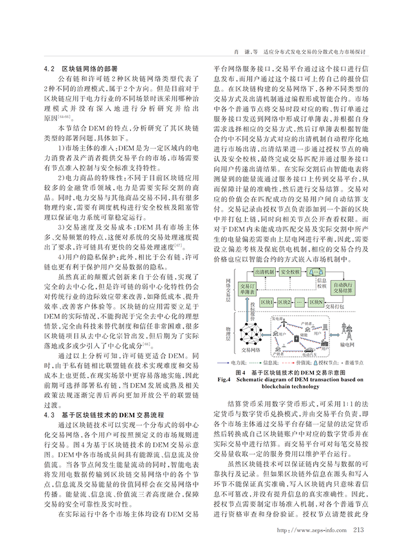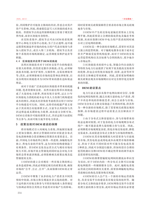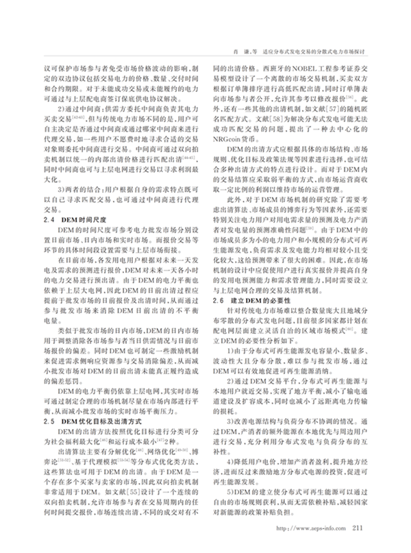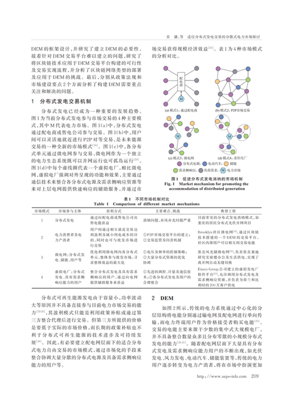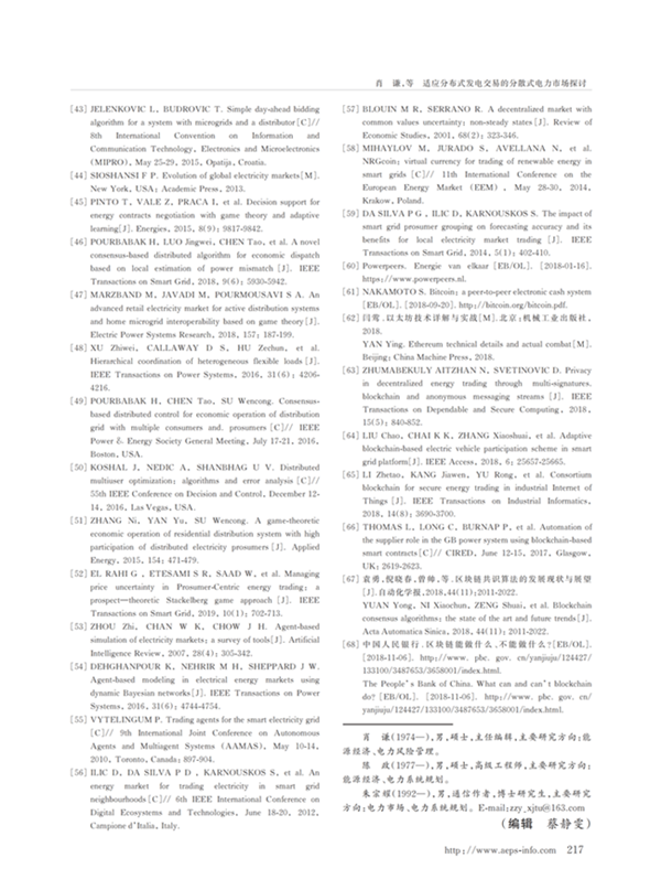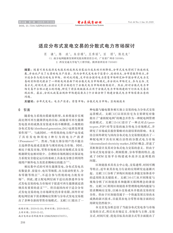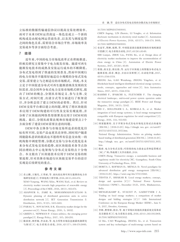 随着可再生能源发电技术的成熟及安装运行成本的不断降低,分布式发电得到了快速的发展,并由此产生了大量的电力产消者。然而分布式发电由于容量小、波动性大、分布零散等特点,并不适合参与现行的电力市场。针对此问题,文中结合国外电力零售市场研究和中国分布式电力交易的实际情况提出了一种配电网层面下的分散式电力市场模式,并分别从市场定义、参与主体、交易方式、时间尺度、出清方式等方面进行了分散式电力市场的框架设计。然后,针对分散式电力市场交易平台难以建立的问题,研究了将区块链技术应用于分散式电力市场构建的可行性及交易实现流程。最后,分别从政策法规和市场建设要点 2 个方面分析了构建分散式电力市场需要注意的问题。
