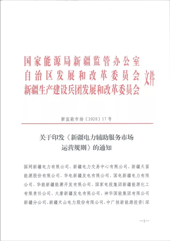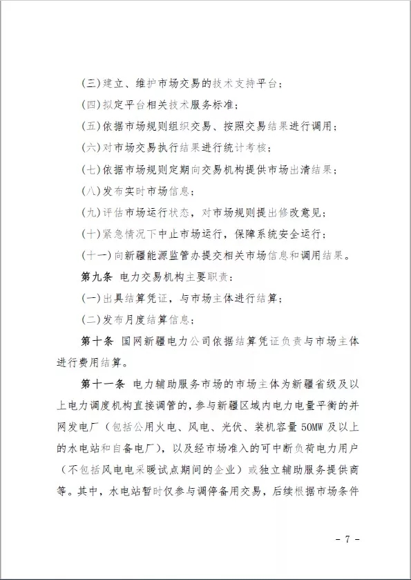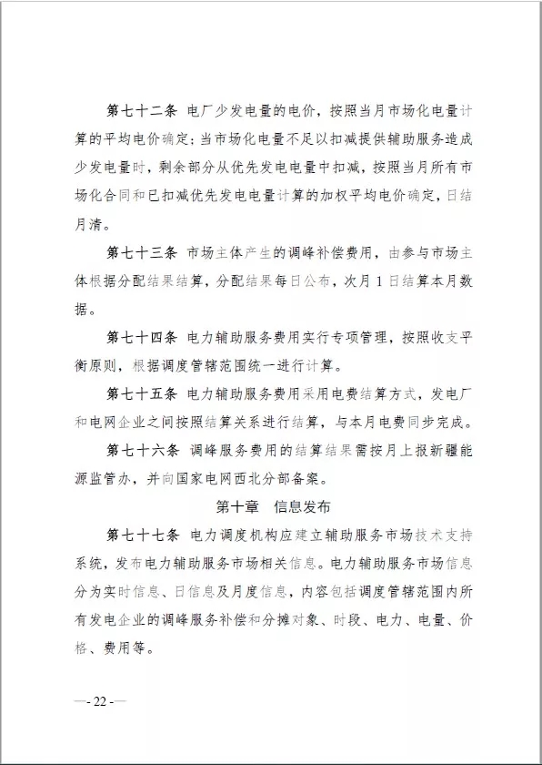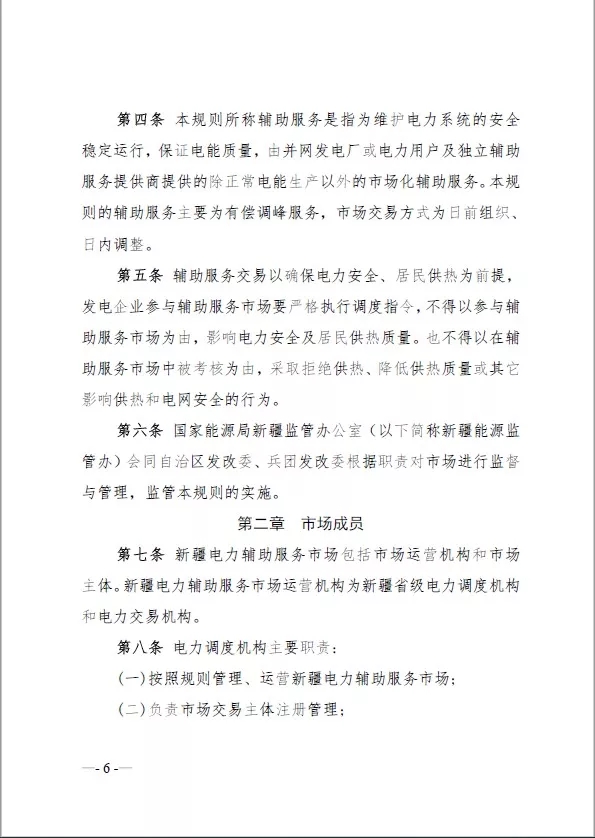 日前新疆能监办印发《新疆电力辅助服务市场运营规则》的通知,规则中明确:实时深度调峰交易采用“阶梯式”报价方式和价格机制,发电企业在不同时期分两档浮动报价。市场成员包括市场运营机构和市场主体。电力辅助服务市场的市场主体为新疆省级及以上电力调度机构直接调管的,参与新疆区域内电力电量平衡的并网发电厂(包括公用火电、风电、光伏、装机容量 50MW 及以上的水电站和自备电厂),以及经市场准入的可中断负荷电力用户(不包括风电电采暖试点期间的企业)或独立辅助服务提供商等。