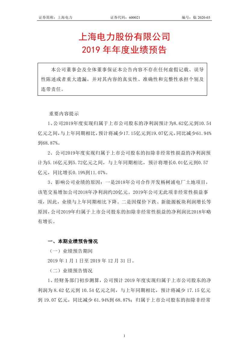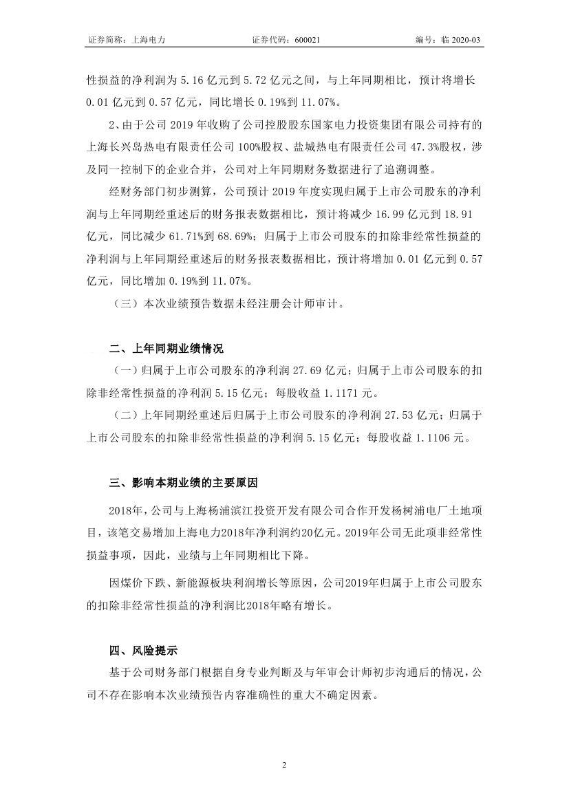 上海电力近日公告,预计2019年度净利润为8.62亿元到10.54亿元之间,同比减少61.94%到68.87%。扣非后净利为5.16亿元到5.72亿元之间,同比增长0.19%到11.07%。2018年,公司与上海杨浦滨江投资开发有限公司合作开发杨树浦电厂土地项目,该笔交易增加上海电力2018年净利润约20亿元。2019年公司无此项非经常性损益事项。