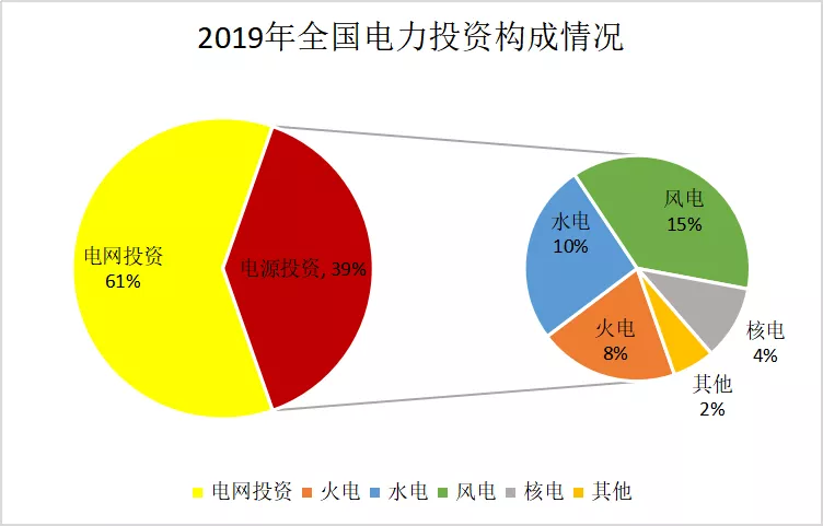 2019年,全国电力投资累计7995亿元,同比下降2.0%。其中,电源投资3139亿元(其中:水电814亿元、火电630亿元、核电335亿元、风电1171亿元);电网投资4856亿元。