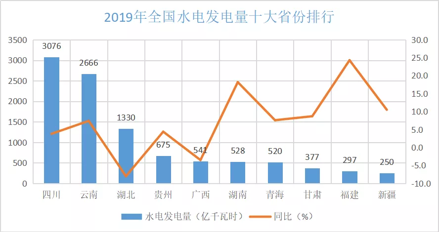 2019年,全国水电发电量排行前十的省份分别是:四川3076亿千瓦时、云南2666亿千瓦时、湖北1330亿千瓦时、贵州675亿千瓦时、广西541亿千瓦时、湖南528亿千瓦时、青海520亿千瓦时、甘肃377亿千瓦时、福建297亿千瓦时、新疆250亿千瓦时。