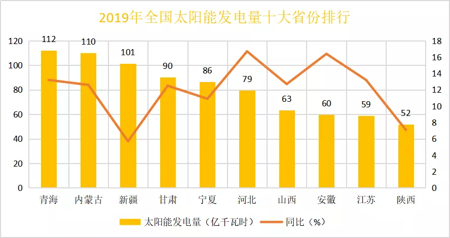 2019年,全国太阳能发电量排行前十的省份分别是:青海112亿千瓦时、内蒙古110亿千瓦时、新疆101亿千瓦时、甘肃90亿千瓦时、宁夏86亿千瓦时、河北79亿千瓦时、山西63亿千瓦时、安徽60亿千瓦时、江苏59亿千瓦时、陕西52亿千瓦时。