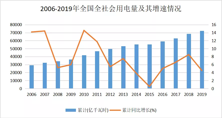 2019年,全国全社会用电量累计72255亿千瓦时,同比增长4.5%。