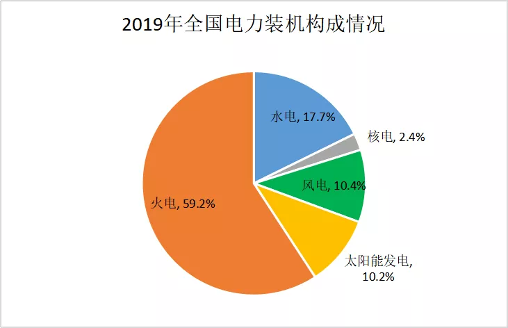 截至2019年底,全国发电装机容量201066万千瓦,同比增长5.8%。其中,火电装机119055万千瓦,占总装机容量的59.2%;水电(35640万千瓦)、核电(4874万千瓦)、风电(21005万千瓦)、太阳能发电(20468万千瓦)等清洁能源装机总容量已达81987万千瓦,占总装机容量的40.8%。具体构成见下图: