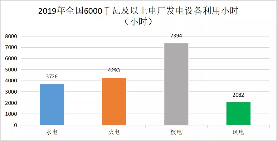 2019年,全国6000千瓦及以上电厂发电设备累计平均利用小时为3825小时。其中,水电3726小时、火电4293小时、核电7394小时、风电2082小时。
