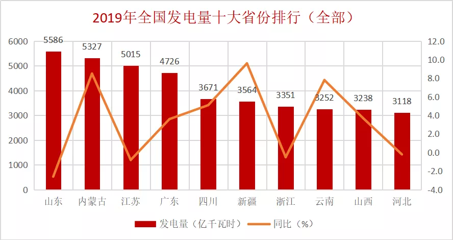 2019年,全国发电量排行前十的省份分别是:山东5586亿千瓦时、内蒙古5327亿千瓦时、江苏5015亿千瓦时、广东4726亿千瓦时、四川3671亿千瓦时、新疆3564亿千瓦时、浙江3351亿千瓦时、云南3252亿千瓦时、山西3238亿千瓦时、河北3118亿千瓦时。