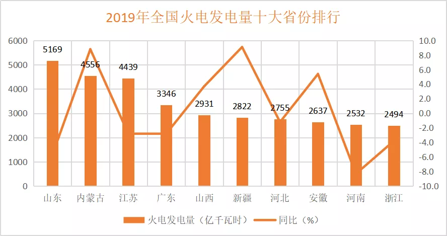 2019年,全国火电发电量排行前十的省份分别是:山东5169亿千瓦时、内蒙古4556亿千瓦时、江苏4439亿千瓦时、广东3346亿千瓦时、山西2931亿千瓦时、新疆2822亿千瓦时、河北2755亿千瓦时、安徽2637亿千瓦时、河南2532亿千瓦时、浙江2494亿千瓦时。