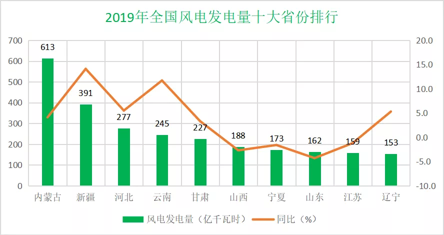 2019年,全国风电发电量排行前十的省份分别是:内蒙古612.8亿千瓦时、新疆391.4亿千瓦时、河北277.3亿千瓦时、云南245.3亿千瓦时、甘肃226.9亿千瓦时、山西188.1亿千瓦时、宁夏173亿千瓦时、山东162.4亿千瓦时、江苏158.6亿千瓦时、辽宁153.1亿千瓦时。