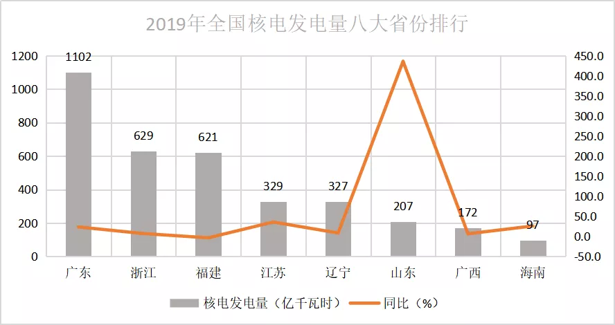 2019年,全国核电发电八大省份的发电量分别是:广东1102亿千瓦时、浙江629亿千瓦时、福建621亿千瓦时、江苏329亿千瓦时、辽宁327亿千瓦时、山东207亿千瓦时、广西172千瓦时、海南97亿千瓦时。