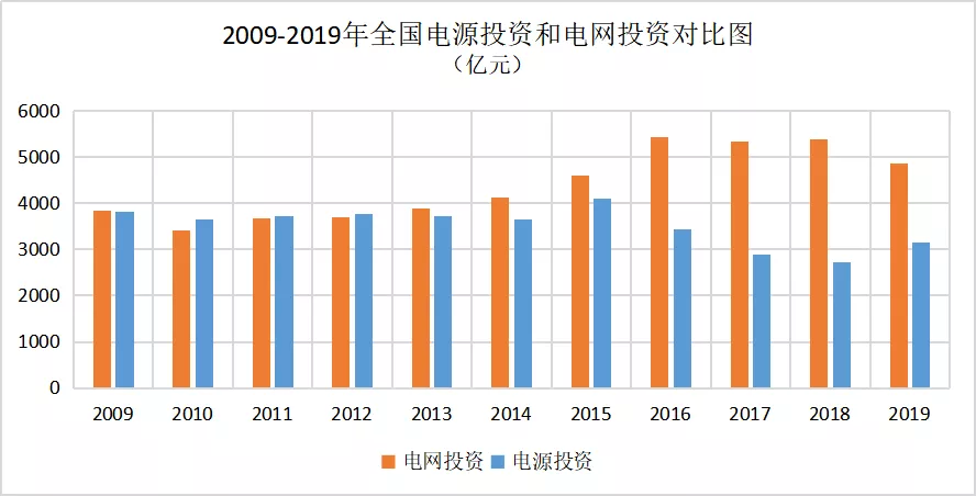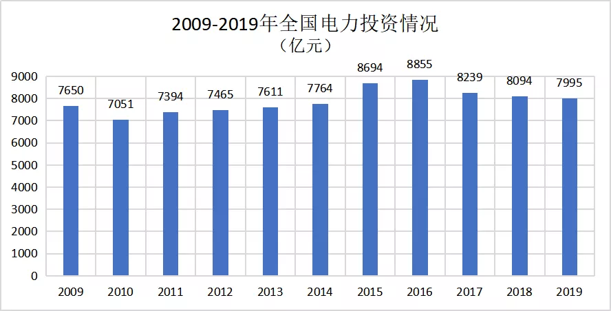 2019年,全国电力投资累计7995亿元,同比下降2.0%。其中,电源投资3139亿元(其中:水电814亿元、火电630亿元、核电335亿元、风电1171亿元);电网投资4856亿元。