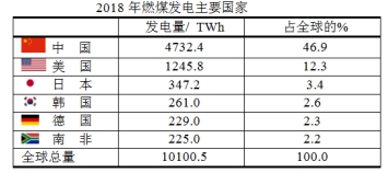 由于燃煤发电价廉,一直居高位,2011年占全球发电总量的9144/22126= 41.3%,到2018年回落速度缓慢,仍然保持在10100.5/26614.8= 38.0%。2018年最大的燃煤发电生产国是中国,占全球燃煤发电总量的46.9%;其次是美国,占总量的 12.3%,比往年逐步回落。