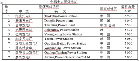 燃煤发电仍然霸占全球电力生产的主导地位,主要生产国是中国,在全球前十位中占六席。第一位由托克托电厂取代了原来的台中发电厂。