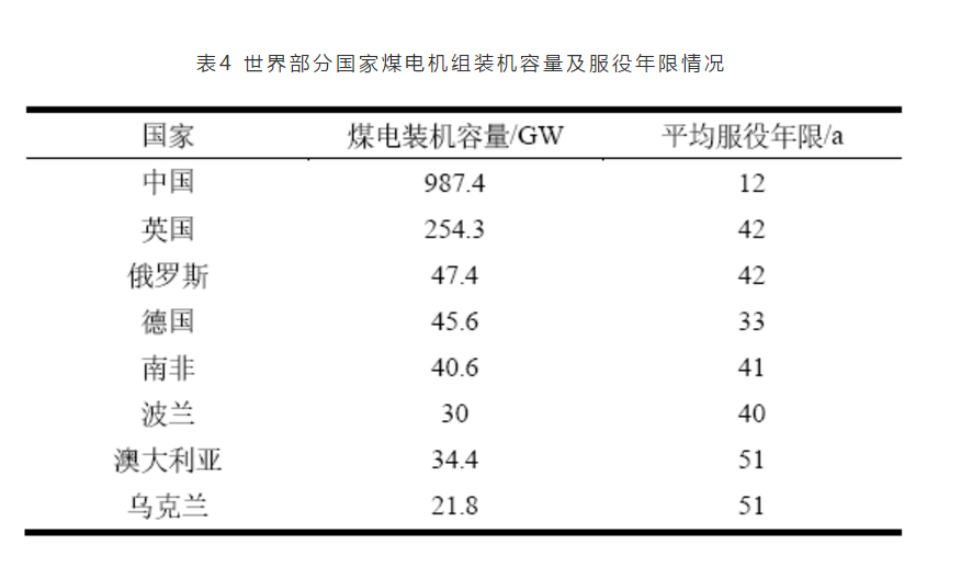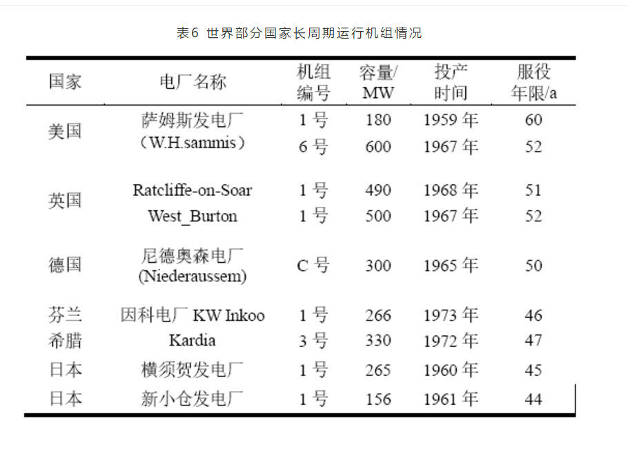 1)从全球范围内煤电机组服役年限来看,国内外煤电机组均有40年或50年以上服役年限的案例,说明传统设计寿命为30年的煤电机组实际服役年限远超过30年。