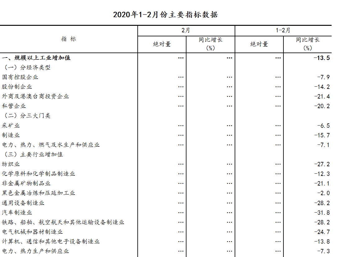 1-2月份,规模以上工业增加值同比下降13.5%。分经济类型看,国有控股企业增加值下降7.9%;股份制企业下降14.2%,外商及港澳台商投资企业下降21.4%;私营企业下降20.2%。分三大门类看,采矿业增加值下降6.5%,制造业下降15.7%,电力、热力、燃气及水生产和供应业下降7.1%。从产品产量看,医疗防护和生活所需物资增长较快,口罩、发酵酒精产量分别增长127.5%和15.6%,冻肉和方便面分别增长13.5%和11.4%。高技术产品增势良好,智能手表、智能手环、半导体分立器件和集成电路产量分别增长119.7%、45.1%、31.4%和8.5%。基本原材料生产平稳,生铁、粗钢、平板玻璃、十种有色金属产量分别增长3.1%、3.1%、2.3%和2.2%。全国采购经理调查数据结果显示,截至2月25日,大中型制造业企业复工率达到85.6%,生产经营活动正有序恢复。