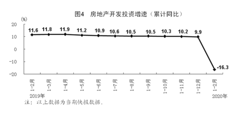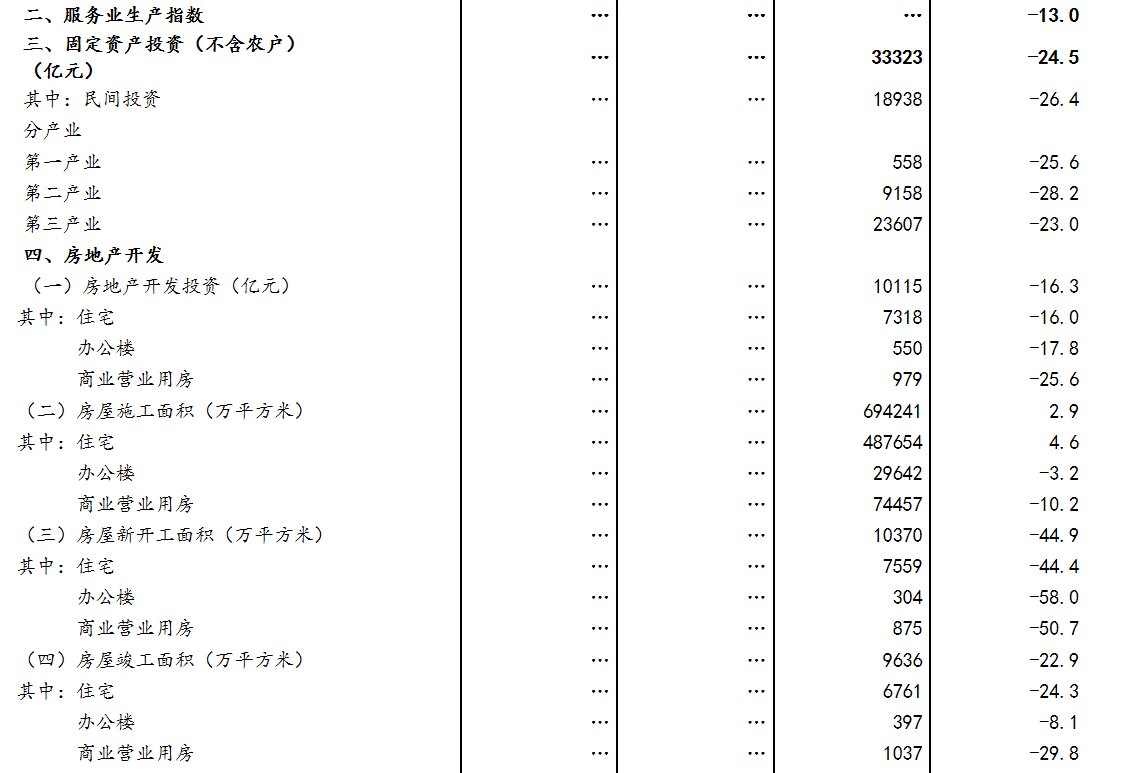 1-2月份,全国固定资产投资(不含农户)33323亿元,同比下降24.5%。分领域看,基础设施投资同比下降30.3%,制造业投资下降31.5%,房地产开发投资下降16.3%。全国商品房销售面积8475万平方米,下降39.9%;商品房销售额8203亿元,下降35.9%。分产业看,第一产业投资下降25.6%,第二产业投资下降28.2%,第三产业投资下降23.0%。民间投资18938亿元,下降26.4%。高技术产业投资下降17.9%,降幅低于全部投资6.6个百分点,其中高技术制造业和高技术服务业投资分别下降16.5%和20.8%。检验检测服务和专业技术服务投资分别增长26.1%和4.3%。社会领域投资下降20.0%,其中卫生领域投资下降11.2%,降幅低于全部投资13.3个百分点。