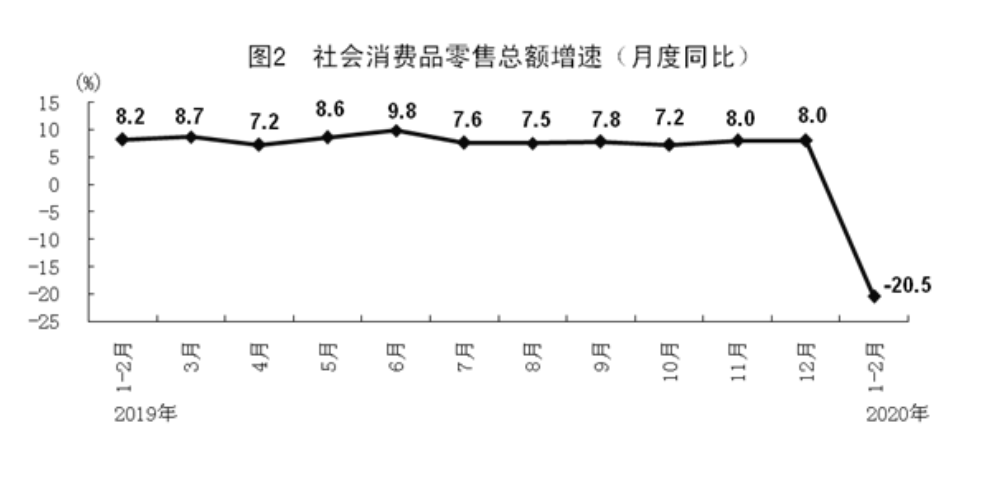 根据第四次全国经济普查结果对2019年社会消费品零售总额进行了修订,2020年1-2月份增速按照可比口径计算。