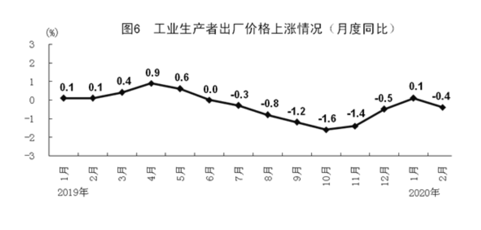 1-2月份,全国工业生产者出厂价格同比下降0.2%。分月看,1月份全国工业生产者出厂价格同比上涨0.1%,环比持平;2月份全国工业生产者出厂价格同比下降0.4%,环比下降0.5%。1-2月份,全国工业生产者购进价格同比下降0.4%。