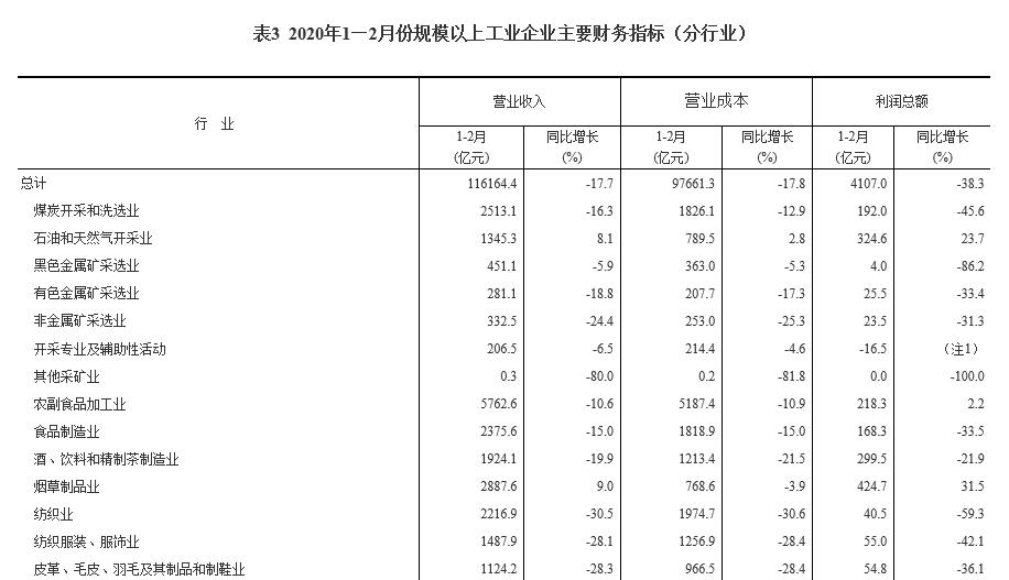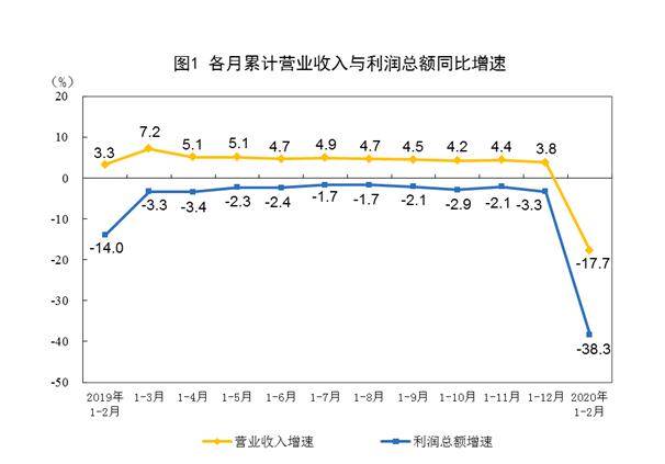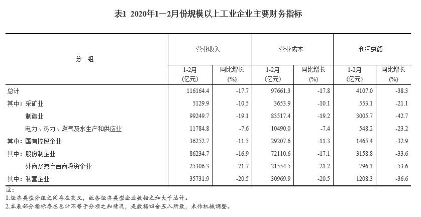 1—2月份,全国规模以上工业企业实现利润总额4107.0亿元,同比下降38.3%(按可比口径计算,详见附注二)。