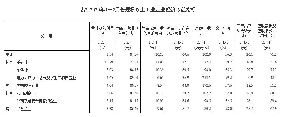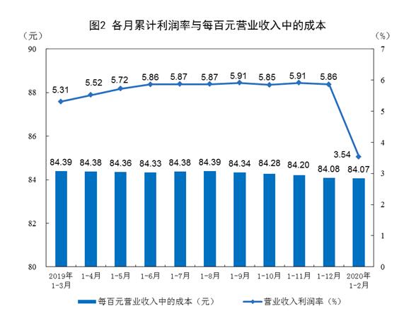 1—2月份,规模以上工业企业实现营业收入11.62万亿元,同比下降17.7%;发生营业成本9.77万亿元,下降17.8%;营业收入利润率为3.54%,同比降低1.17个百分点。