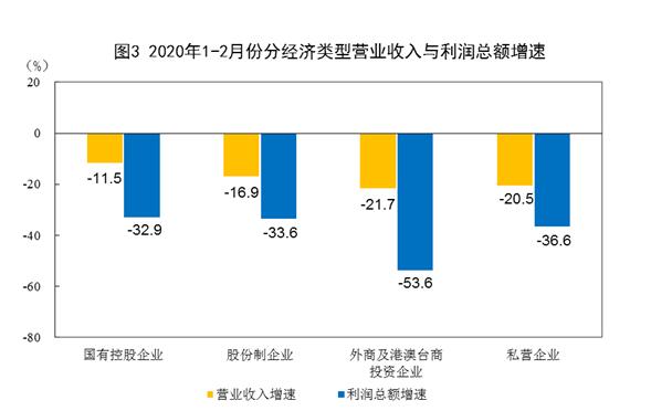 1—2月份,规模以上工业企业中,国有控股企业实现利润总额1465.4亿元,同比下降32.9%;股份制企业实现利润总额3158.8亿元,下降33.6%;外商及港澳台商投资企业实现利润总额796.3亿元,下降53.6%;私营企业实现利润总额1208.3亿元,下降36.6%。